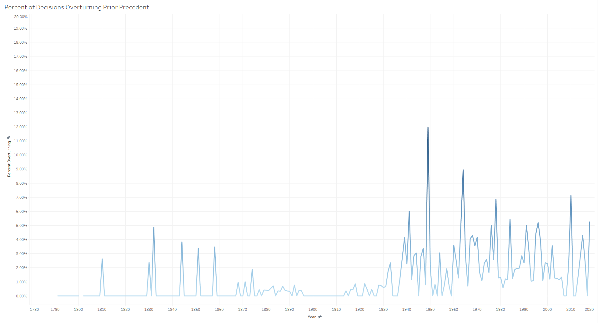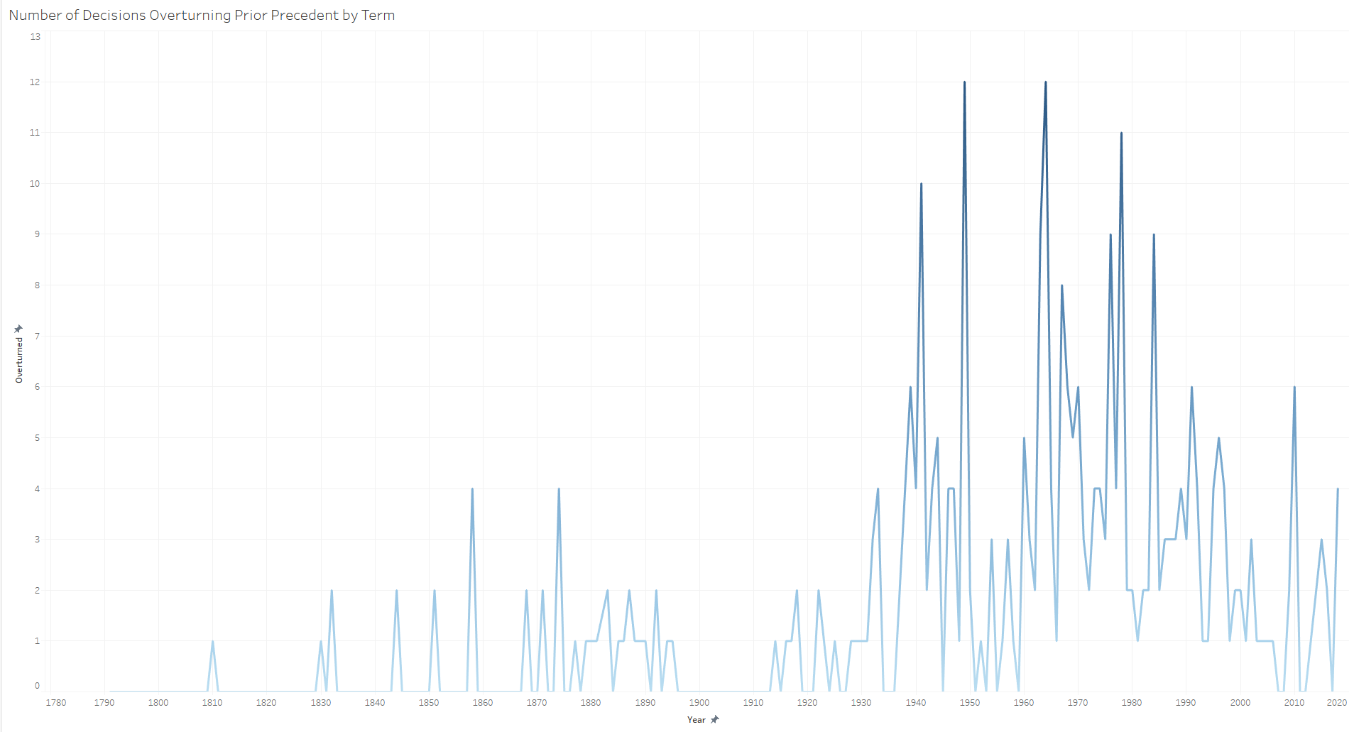 The big spikes are from around the Hughes/Stone Courts (1930-1946) through the Burger Court (1969-1986). The court had some of its highest decision-volume terms during these years, which, along with the court’s shifting perspectives on various rights enforced through constitutional amendments, helps explain a bit of this decision-making. Although the court’s rate of overturning its previous decisions did drop slightly during this period, the drop-off does not look as significant when the overturned decisions are examined as percent of the court’s total decision output per term.