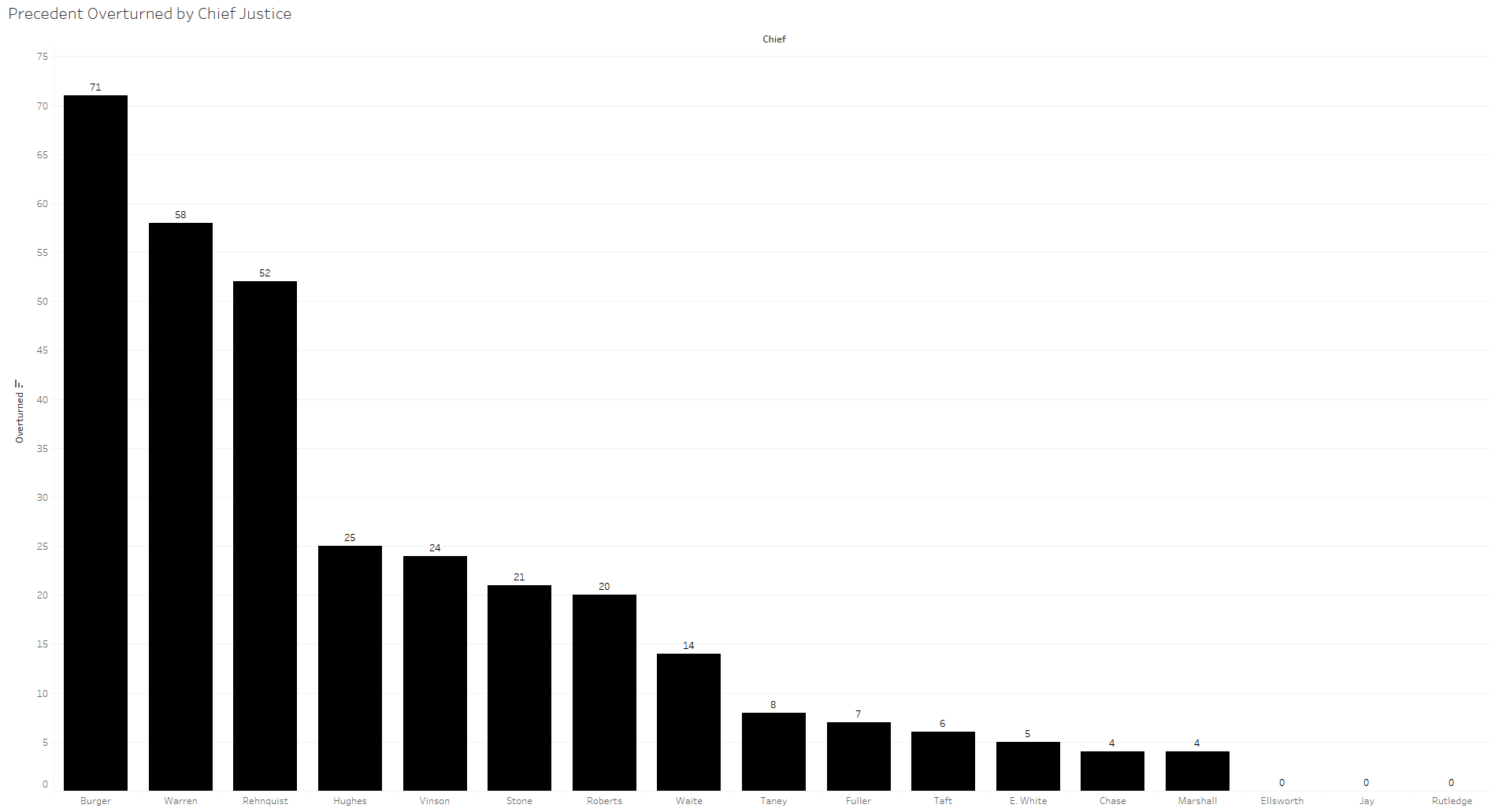 In absolute terms, these counts of overturning decisions line up as expected by chief justice, with decisions under Chief Justice Warren Burger at the top followed by those under Chief Justice Earl Warren.