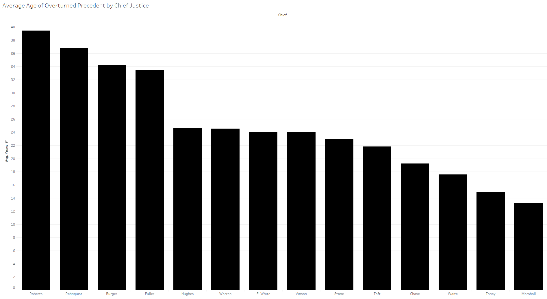 Although the chief justices do not perfectly order themselves in sequence from first to most recent, the three chiefs with the oldest precedents overturned on average during their tenures are the last three chiefs.