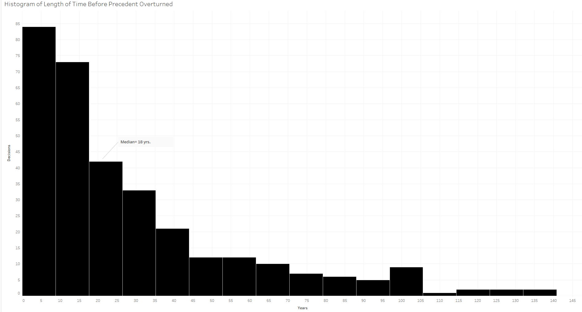 While the median age for overturned decisions is 18 years, the distribution actually extends from zero years — in several instances when the court reheard the same case in the same year — to 137 years, when Justice Thurgood Marshall authored the majority opinion in Exxon Corp. v. Central Gulf Line overturning Justice Robert Cooper Grier’s decision in Minturn v. Maynard.