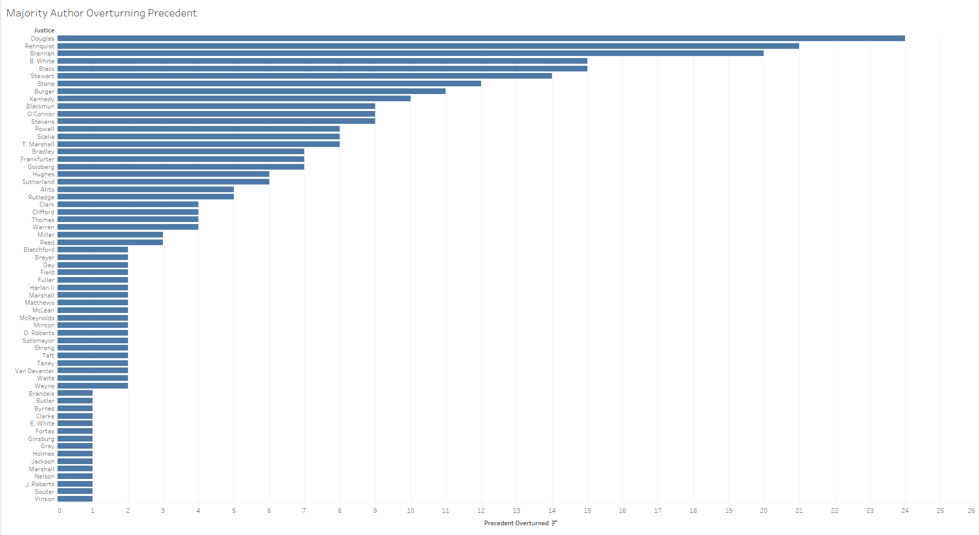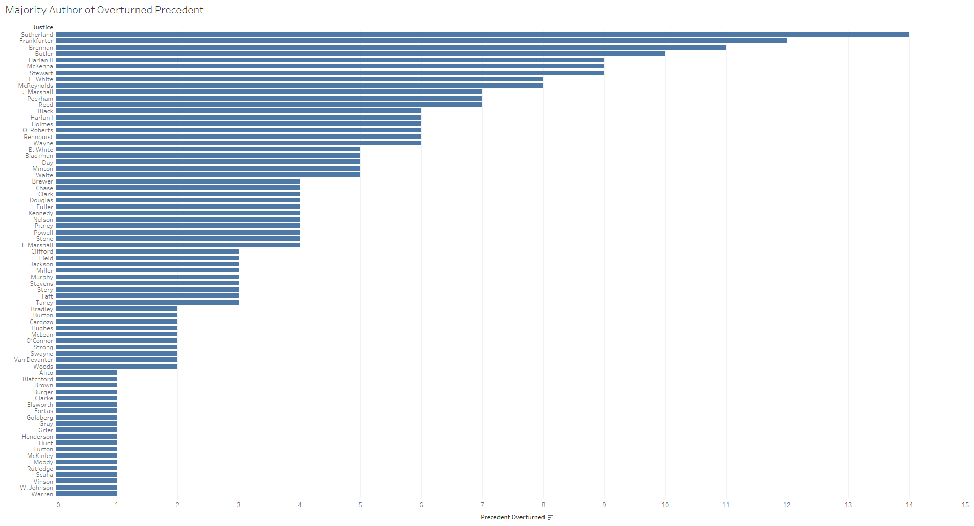 Some of the most interesting findings from this data relate to the justices who were most active in terms of overturning prior precedent. One caveat is that because the justices didn’t overturn many decisions in the Supreme Court’s early years, not many of those justices were active overturners. The justices are ordered below from those who overturned the most decisions to those who overturned the fewest.