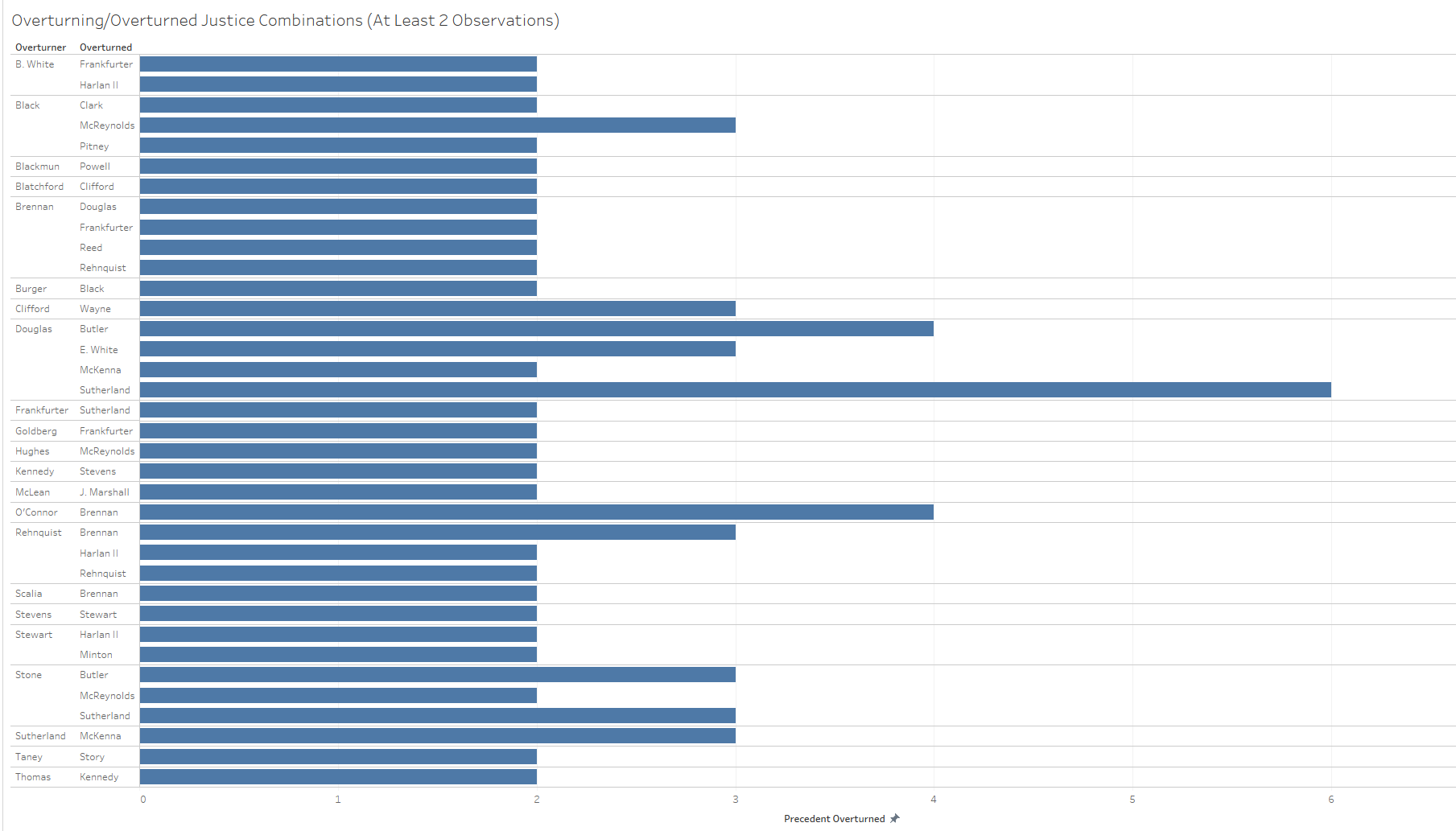 Several justices overturned certain justices multiple times. This series of justices follows neatly from the above data, with the most dominant combo being Douglas as overturner and Sutherland as overturnee. The figure only looks at combos with more than one decision overturned.