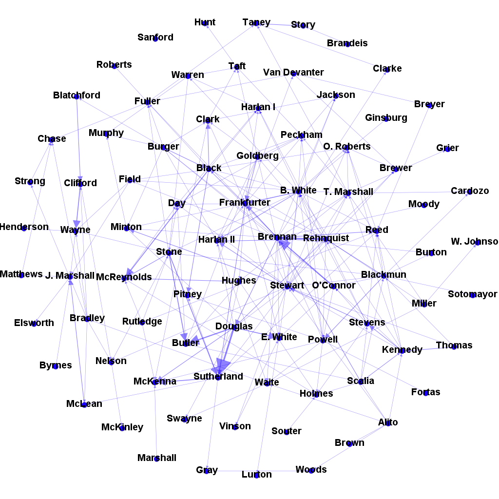 These relationships can also be used to construct an overturning case network of the most active justices. In the graph below, justices who both overturned decisions and had their own decisions overturned are packed toward the center. Justices less involved in such decisions are more toward the periphery. Directed arrows show relationships between overturner and overturnee and the size of an arrow depicts the magnitude of this relationship.
