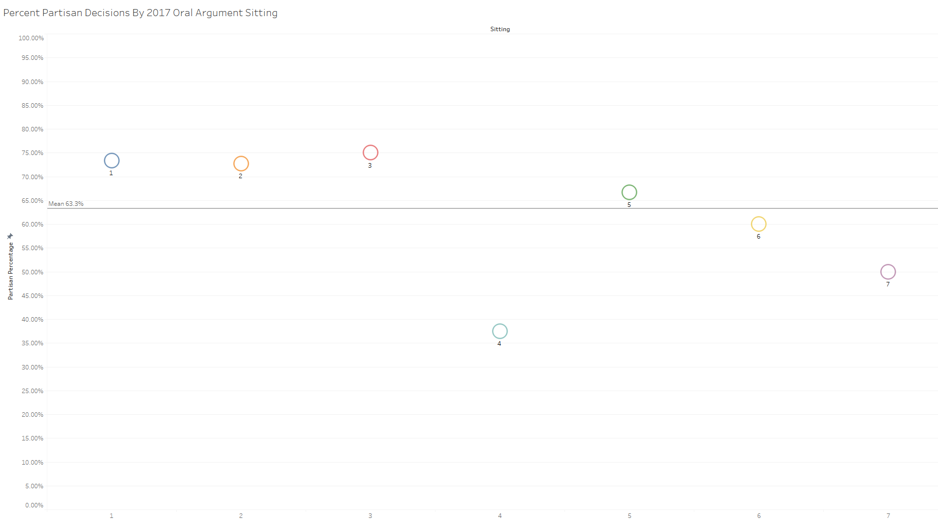 Each sitting aside from the January sitting had at least half of its decisions marked by partisan differences. The first three sittings each had over 70-percent partisan decision-making (73.3 percent, 72.7 percent and 75 percent, respectively). The average percentage across sittings does not equate to the total mean value because the number of coded arguments per sitting differs.