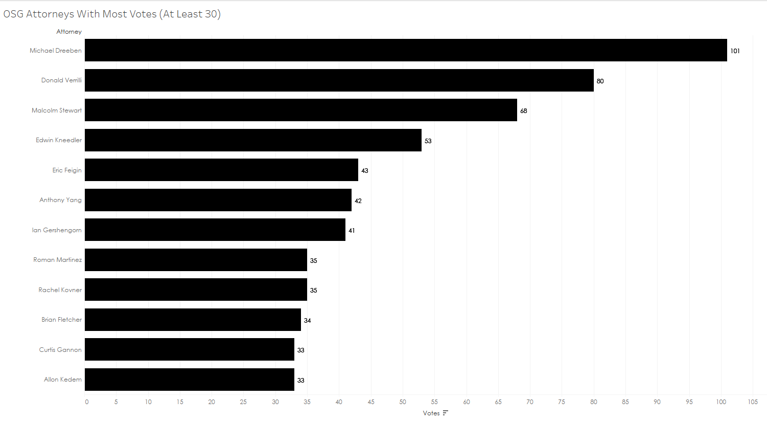 The justices voted more frequently against several of the attorneys with the most overall votes, including Dreeben and Verrilli, than they voted for these attorneys. The most successful attorneys based on these cumulative voting percentages were Ian Gershengorn, another former solicitor general, and previously mentioned Edwin Kneedler.