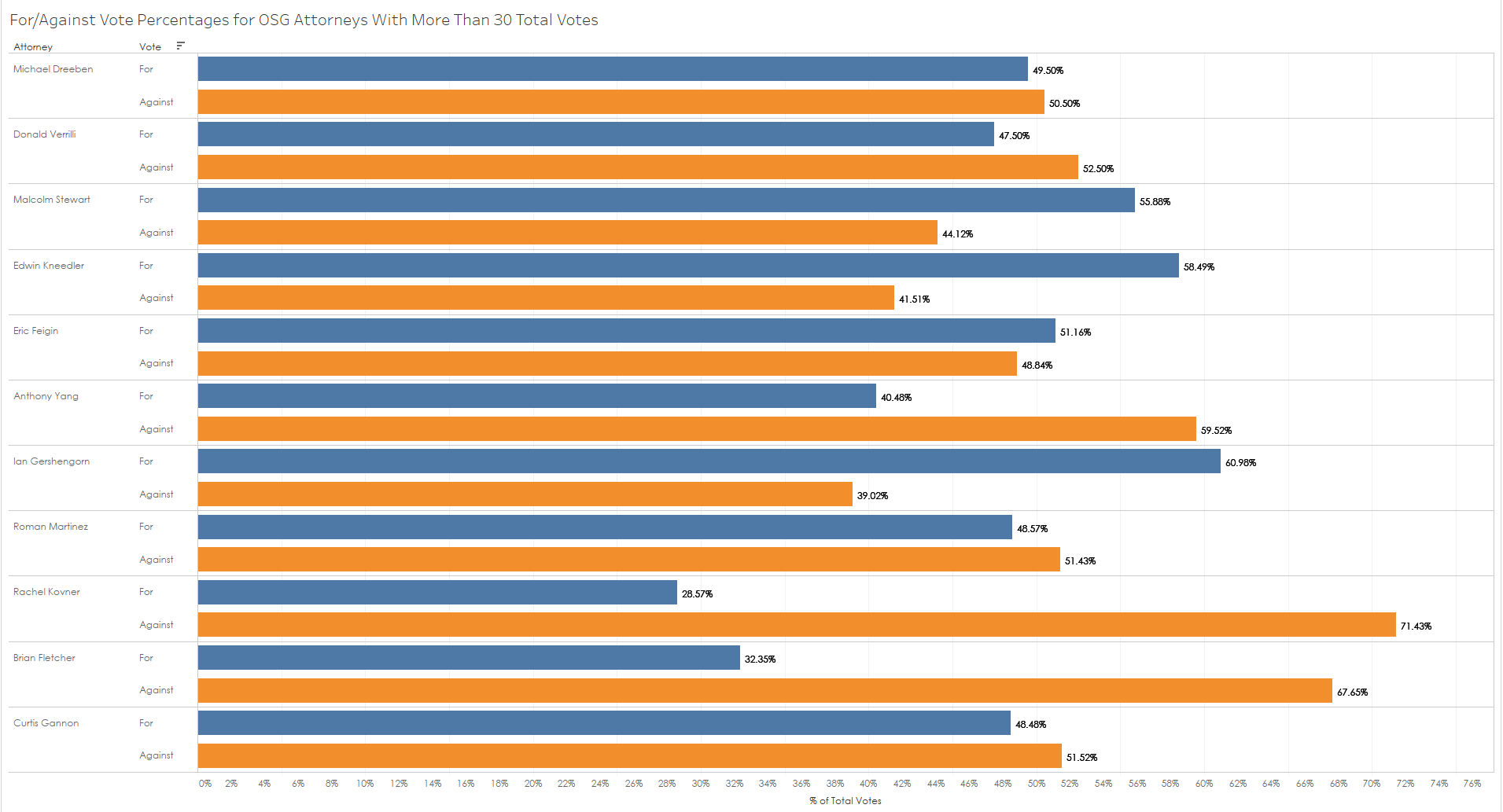 By matching the cases these attorneys argued with the justices’ votes from the Supreme Court Database, we get a look at how successfully the attorneys fared. The following graph shows whether the balance of the justices’ votes in cases argued by these government attorneys was for or against the positions argued by these attorneys.