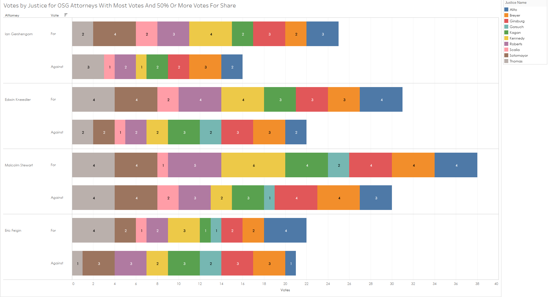 Only four of the 11 government attorneys in the earlier graphs had vote-for shares of 50 percent or more. The justices’ votes were more polarized for some of these attorneys than others. Ian Gershengorn, who received the highest positive vote share, with almost 61 percent, received balanced votes from most justices. Justices Clarence Thomas and Stephen Breyer were the only justices to vote against him more often than they voted for him. Justices Sonia Sotomayor and Anthony Kennedy were the most supportive of Gershengorn’s positions, with Sotomayor voting in his favor in all four instances in which she voted and Kennedy voting in his favor in four of the five cases Gershengorn argued before him. Kneedler similarly performed well across justices, with no justices voting against his positions more frequently than they voted for his positions aside from Justice Neil Gorsuch. Stewart saw the greatest positive vote differential from conservatives Chief Justice John Roberts and Kennedy. Eric Feigin received more support from conservatives, Justice Samuel Alito and Thomas, than he did from liberals, Justices Elena Kagan, Ruth Bader Ginsburg, Sotomayor and Breyer.