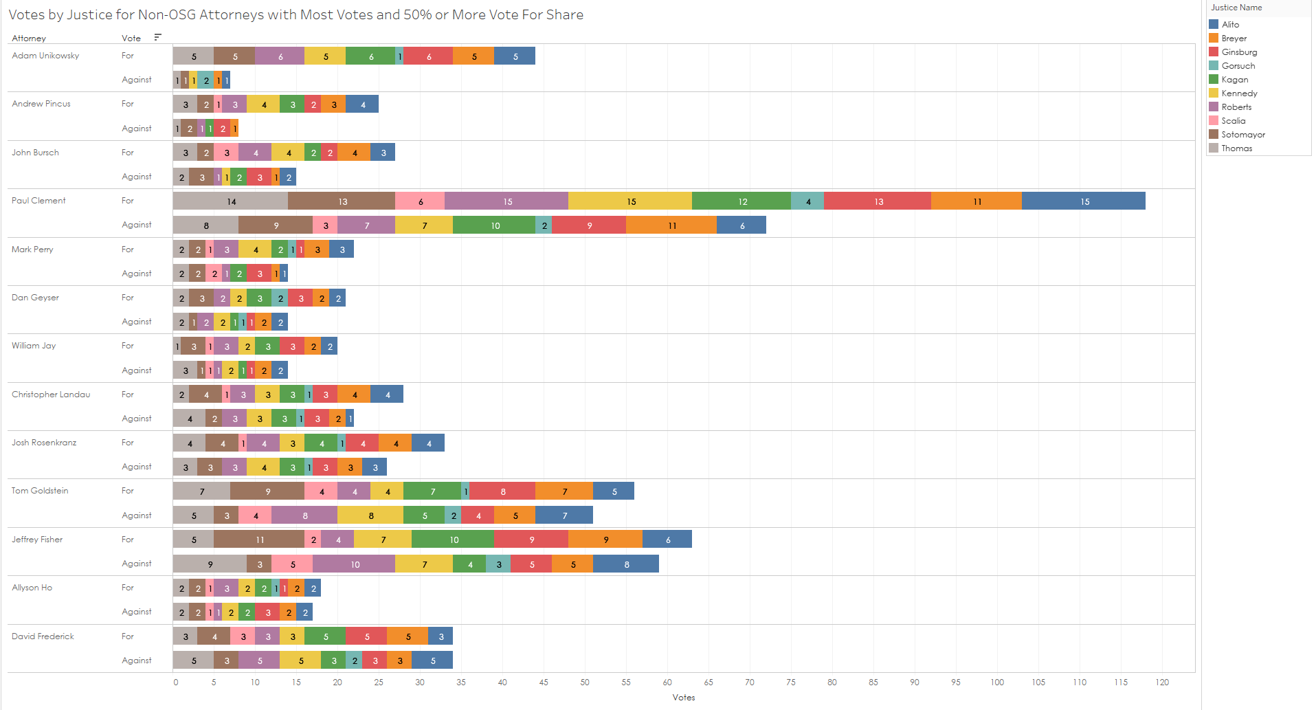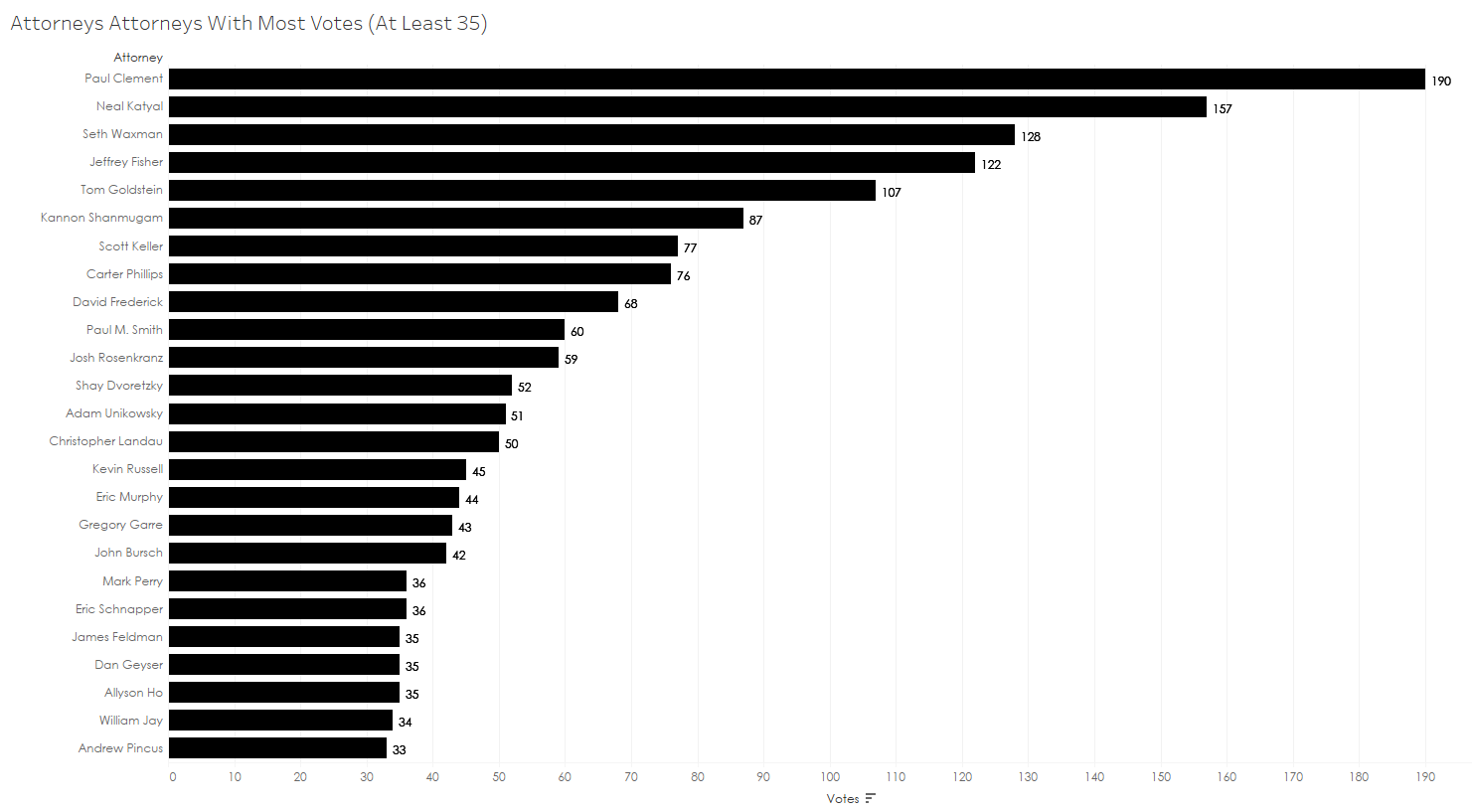 The names at the top of this list include some of the most prolific Supreme Court attorneys in the history of the court. The top three attorneys in terms of total votes for this period – Paul Clement, Neal Katyal and Seth Waxman – each served as the U.S. solicitor general. The next several attorneys on this list vary in their type of practice, from Supreme Court clinic attorney (Stanford’s) Jeffrey Fisher, to private big-law appellate practice attorney Kannon Shanmugam, to boutique-law appellate practice attorney Tom Goldstein, to state-government representative Scott Keller, who is now back in private practice.