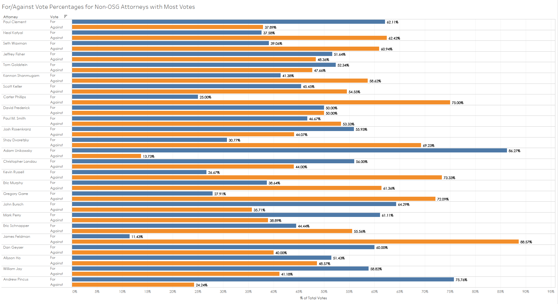 The attorney with the highest overall vote-for share was Adam Unikowsky at 86.27 percent. That is over 10 percent higher than the next most successful attorney across justices, Andrew Pincus, at 75.76 percent. Pincus is also more than 10 percent higher than the third most successful attorney, John Bursch, at 64.29 percent.
