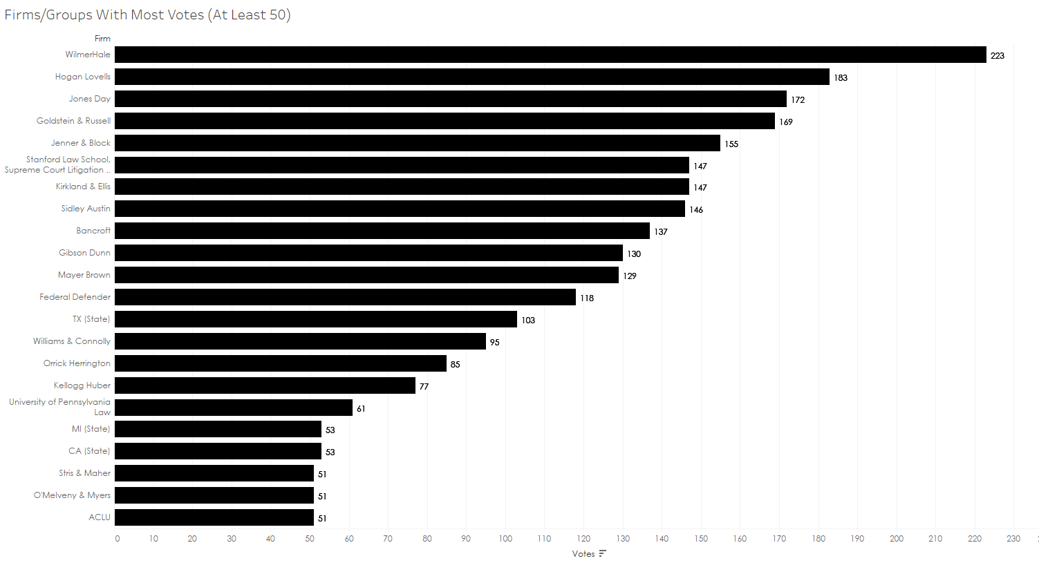 WilmerHale had by far the most justice votes with 223. Seth Waxman argued the majority of these cases but had support from Mark Fleming, Danielle Spinelli and Thomas Saunders, among others. Hogan Lovells received the second most overall votes, with Neal Katyal arguing the majority of the cases, although other cases were argued by Catherine Stetson, Frederick Liu and Dominic Perella.