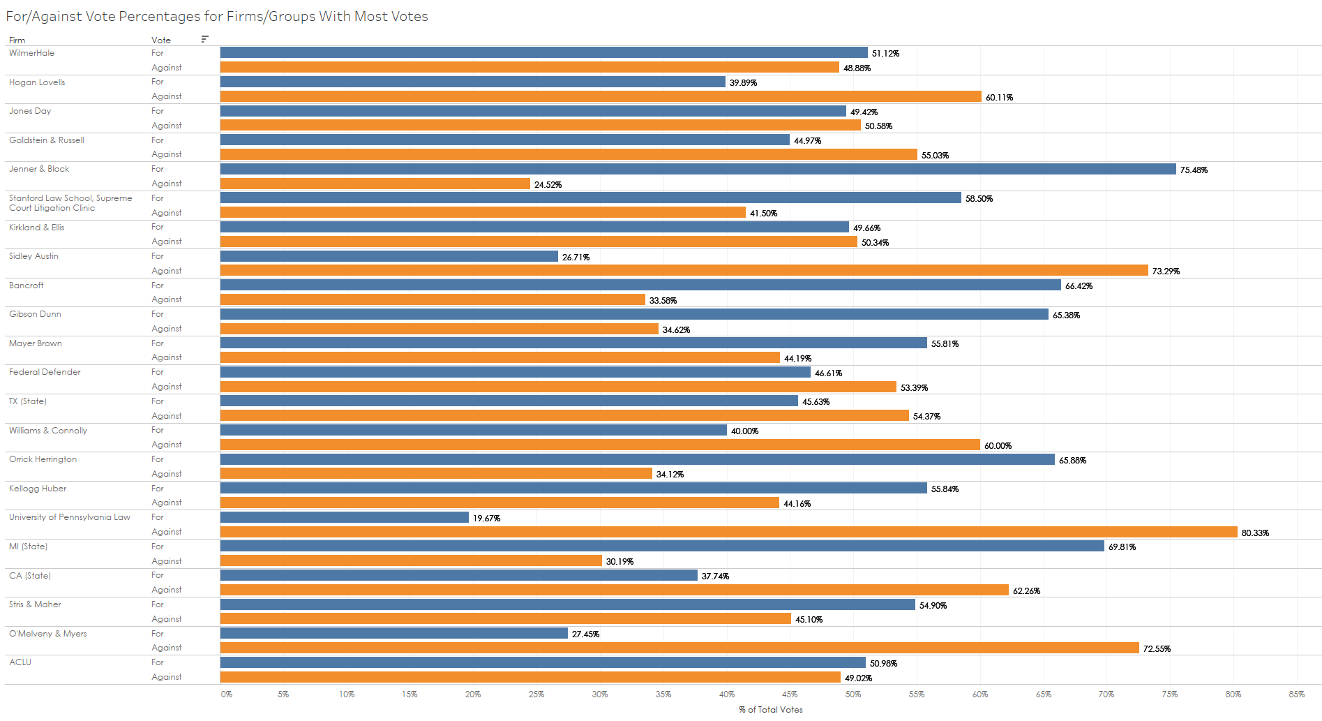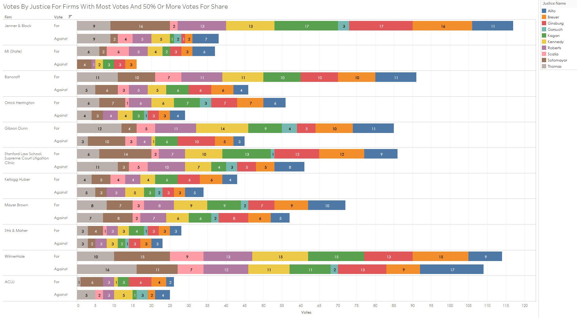 Driven by Adam Unikowsky’s success in the court, Jenner and Block is the top-performing firm in terms of percentage of overall justices’ votes. Nine firms along with Jenner received at least a 50 percent vote-for share from the justices. These 10 firms are included in the next graph breaking down firms by justices’ votes.