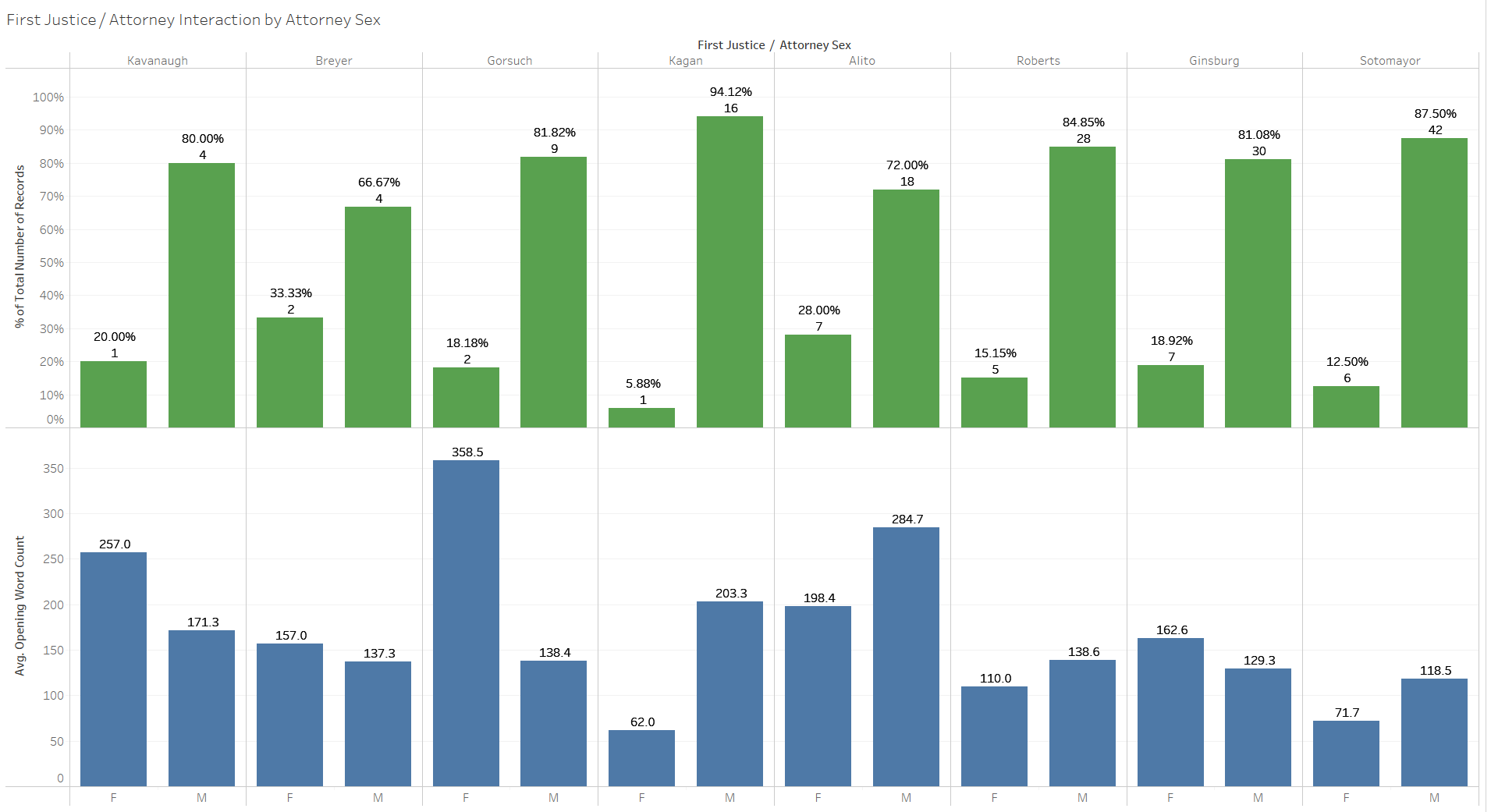 Breyer, Kavanaugh and Gorsuch each had limited opportunities as the first speaking justice and so their statistics are not very informative, although Kavanaugh and Gorsuch maintained close male/female divisions to the overall 83/17 percent baseline for interjecting after male or female attorneys. All three justices let female attorneys speak more words on average than men before jumping into the arguments.
