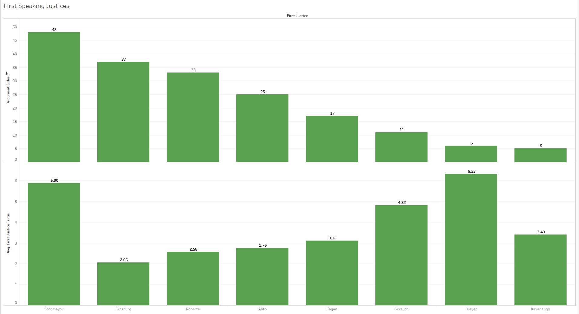 Sotomayor not only spoke first in arguments most frequently, but she also had the most arguments in which she took at least eight talking turns before another justice began speaking.