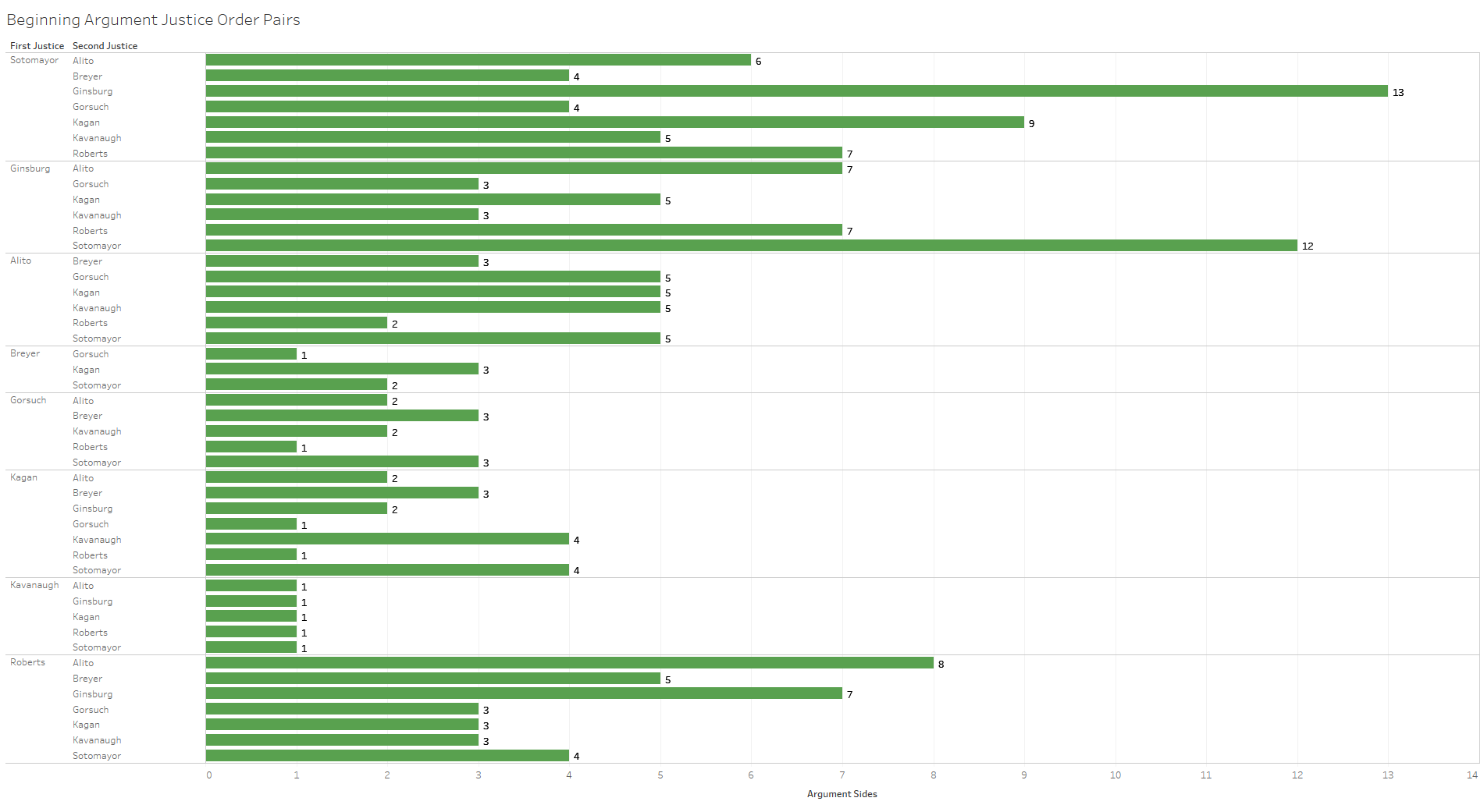 The other justices tended to have less variation in the number of times they followed particular justices. Roberts, for instance, followed Alito most at eight times and Ginsburg second most at seven times. Alito followed Gorsuch, Kagan, Kavanaugh and Sotomayor equally at five times each. These trends regarding the justices’ ordering of speaking give a sense of the justices’ oral argument techniques and how certain justices manage to maintain their lines of inquiry for prolonged portions of arguments.