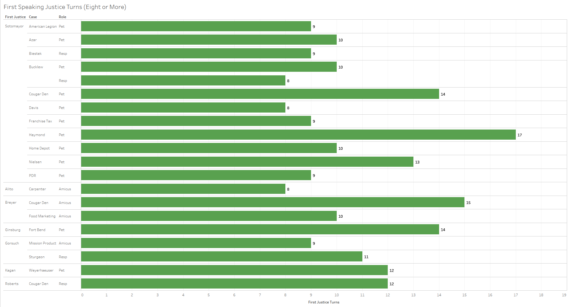 These instances, which show the most consecutive talking turns a justice took in an argument before another justice began speaking, reflect that Sotomayor had the most overall repeat turns in U.S. v. Haymond during Eric Feigin’s argument with 17, and also that Sotomayor took the most opportunities of eight turns in a row or more in the aggregate with 12. All other justices had two instances at most of eight or more talking turns to begin an argument.