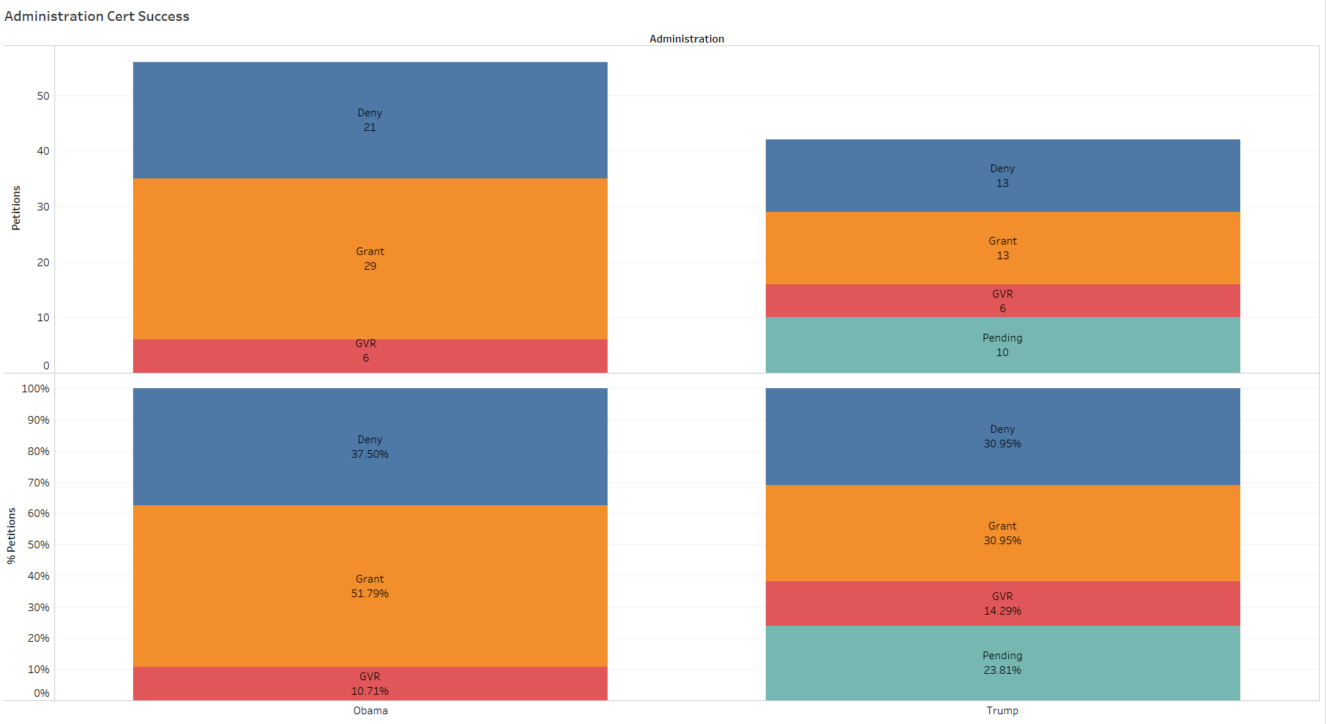 This figure shows that Obama’s OSG had greater success with petition grants with a lower rate of denials, even when excluding Trump’s OSG petitions currently pending. When the pending petitions are removed, Trump’s OSG grant and deny rates both increase to 40.63 percent, which are lower than Obama’s OSG grant percentage and higher than Obama’s OSG deny percentage. When we combine the grants and GVRs, the grant percentages are quite similar, with Obama’s OSG’s combined percentage of 62.5 percent just over Trump’s of 59.38 percent.