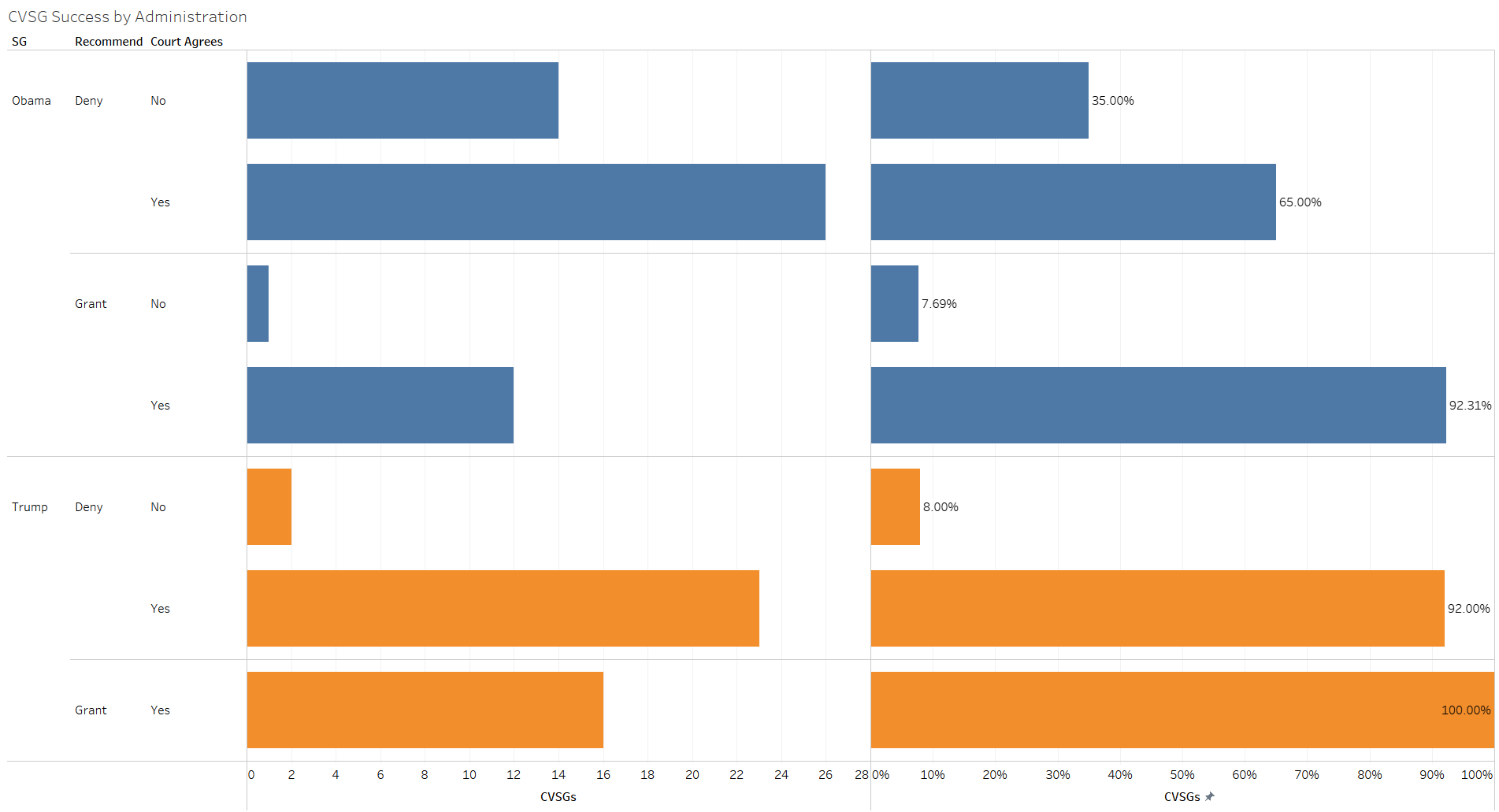 This is one area in which the OSG under Trump has performed much better than the OSG under Obama, as the figure below shows. The CVSG counts are on the left column and the relative percentages are on the right. These figures are based on 41 CVSGs for which the court has decided on cert under Trump’s OSG and 53 CVSGs under Obama’s OSG.