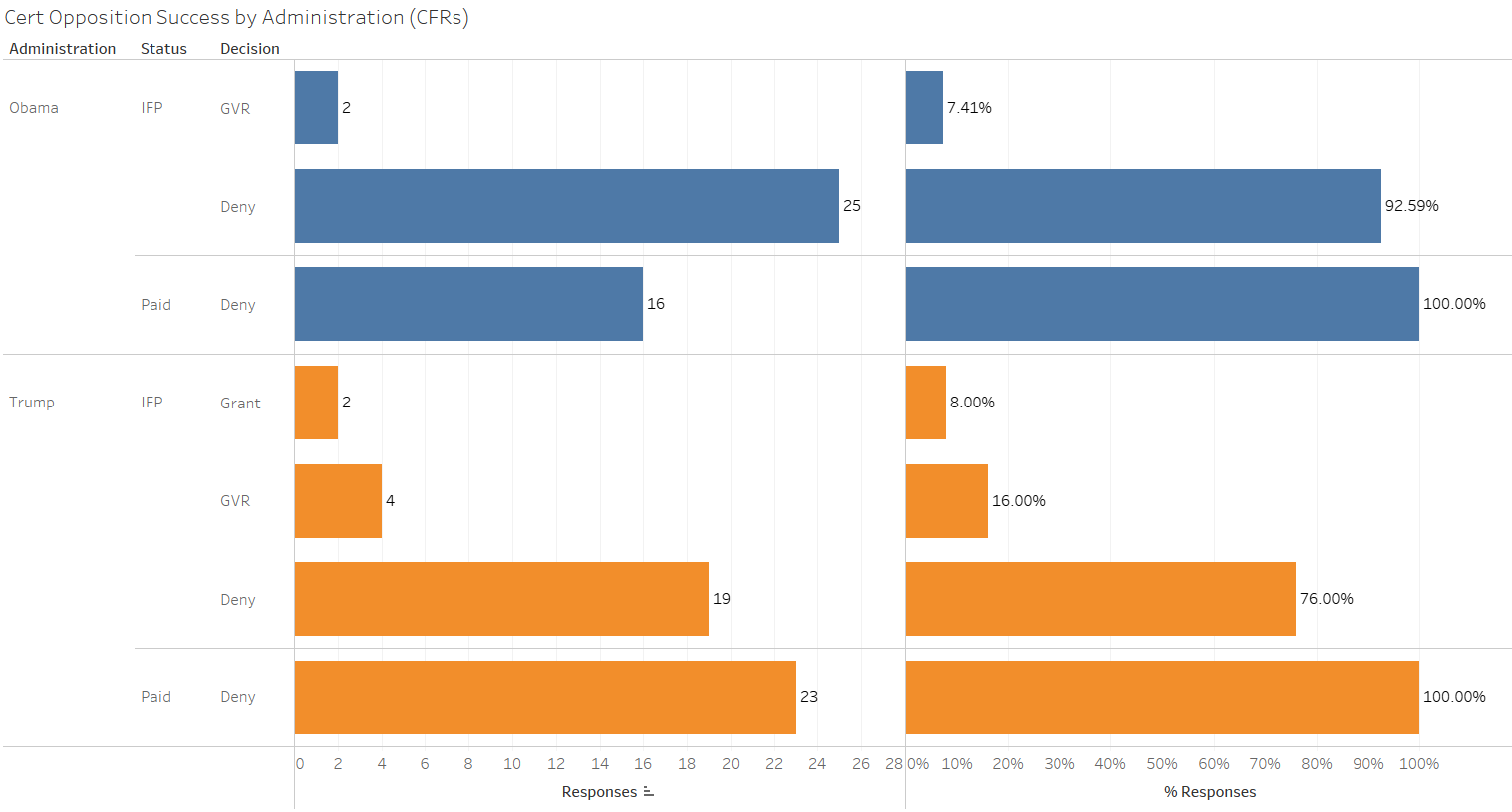 Out of the 16 paid cases with CFRs under Obama’s OSG and 23 paid cases with CFRs under Trump’s OSG, all petitions were denied. This inevitably relates to the sample of paid CFR responses drawn, but shows that a CFR in a paid case does not always enhance the likelihood of a grant, especially in recent years. Because all of the IFP filings in the overall responses were also in response to CFRs (the OSG website did not initially include IFP responses in the random sample selected) the numbers for IFP response are the same here as they are in the figure for all responses, as both show a higher deny rate for Obama’s OSG than for Trump’s OSG. Although there is no separate set of responses to IFP petitions without CFRs in this analysis, the OSG almost always waives the right to respond to IFP petitions and has historically had a very high rate of denials when it responds in IFP cases without CFRs.