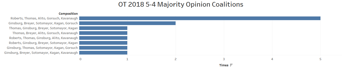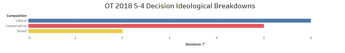 Finally, the diversity of authorship in 5-3 and 5-4 decisions is also readily apparent. With Kennedy no longer taking the bulk of these opinion assignments, these opinions are split more evenly among the justices. Thomas has written the most such decisions so far this term with four, and Kavanaugh is the only other justice who has written more than one 5-4 or 5-3 majority opinion (with two so far), while the remaining seven other justices each wrote one such decision apiece.