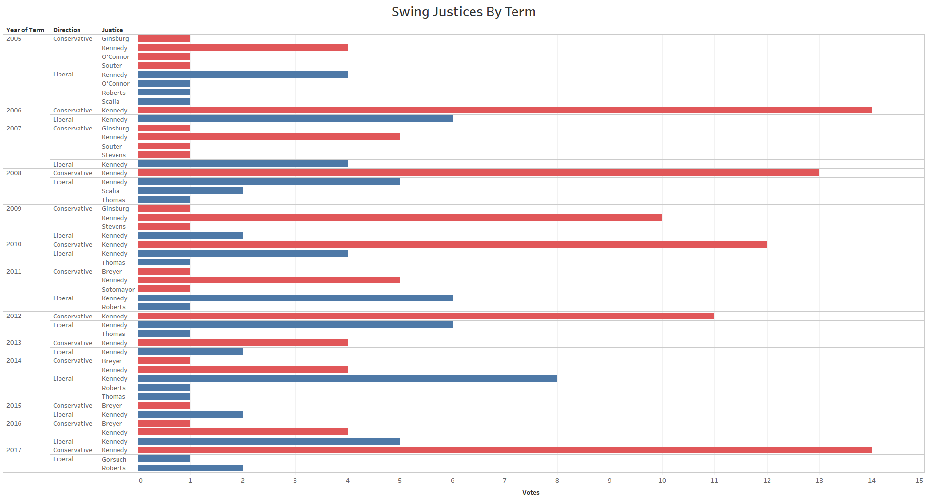 These swing justices are defined as follows: The more conservative coalitions included Justice Antonin Scalia, Thomas, Alito and Roberts through the middle of the 2015 term, and then Gorsuch from the end of the 2016 term forward. A fifth justice voting alongside one of these groupings of four was noted as the swing. The more liberal coalitions included Justices David Souter, John Paul Stevens, Ruth Bader Ginsburg and Stephen Breyer until 2009, then Justice Sonia Sotomayor, Stevens, Ginsburg and Breyer in 2009, and Sotomayor, Justice Elena Kagan, Ginsburg and Breyer for the 2010 term forward. Similar to the conservatives’ swing justices, a swing for the liberals voted along with one of these groupings of four liberal justices.