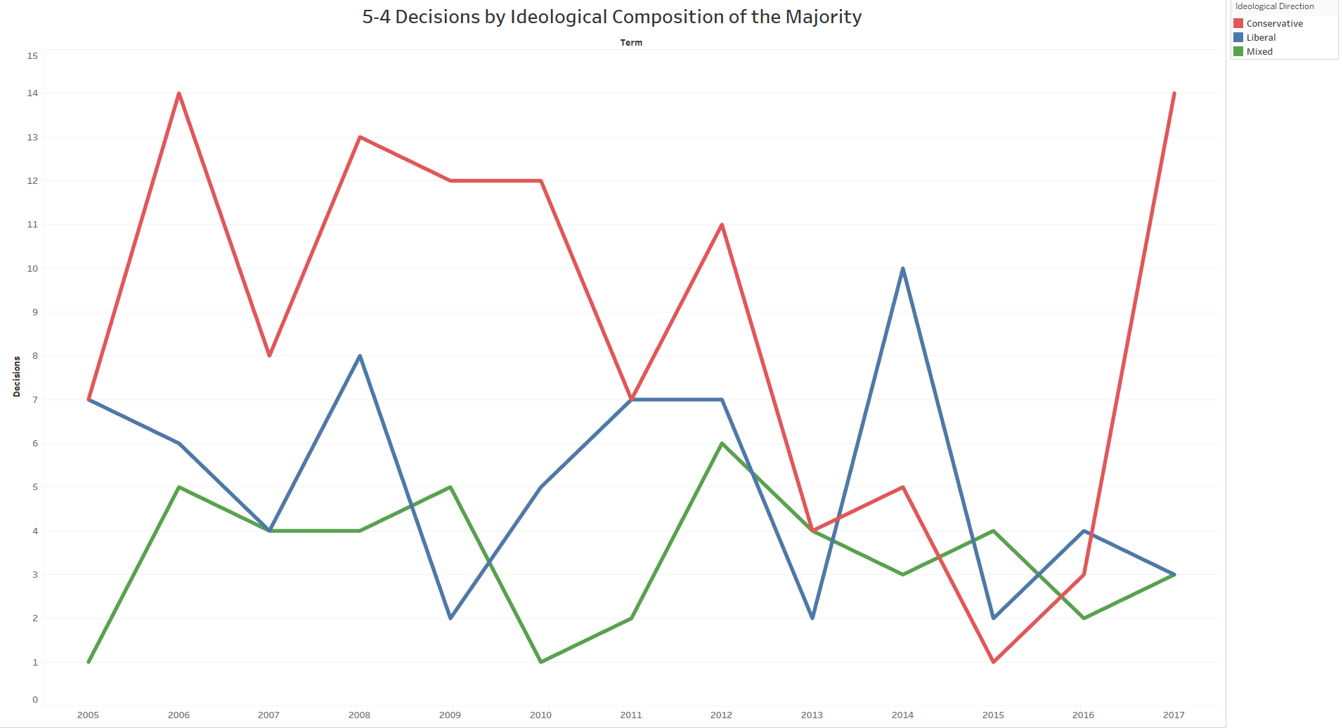 This can also be visualized by combining the justices into liberal, conservative and mixed 5-4 and 5-3 coalitions for the 2005 through 2017 terms. When organized in this fashion the graph looks as follows: