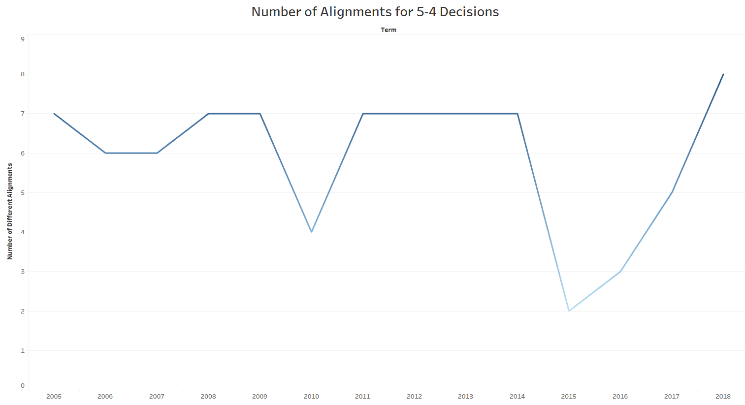 When examined another way, however, the different compositions suggest a new method for the liberal justices whereby they seek a fifth vote among the conservative justices to secure a 5-4 majority. Six of these compositions included all four of the more liberal justices in the majority and a swing vote from one the more conservative justices.
