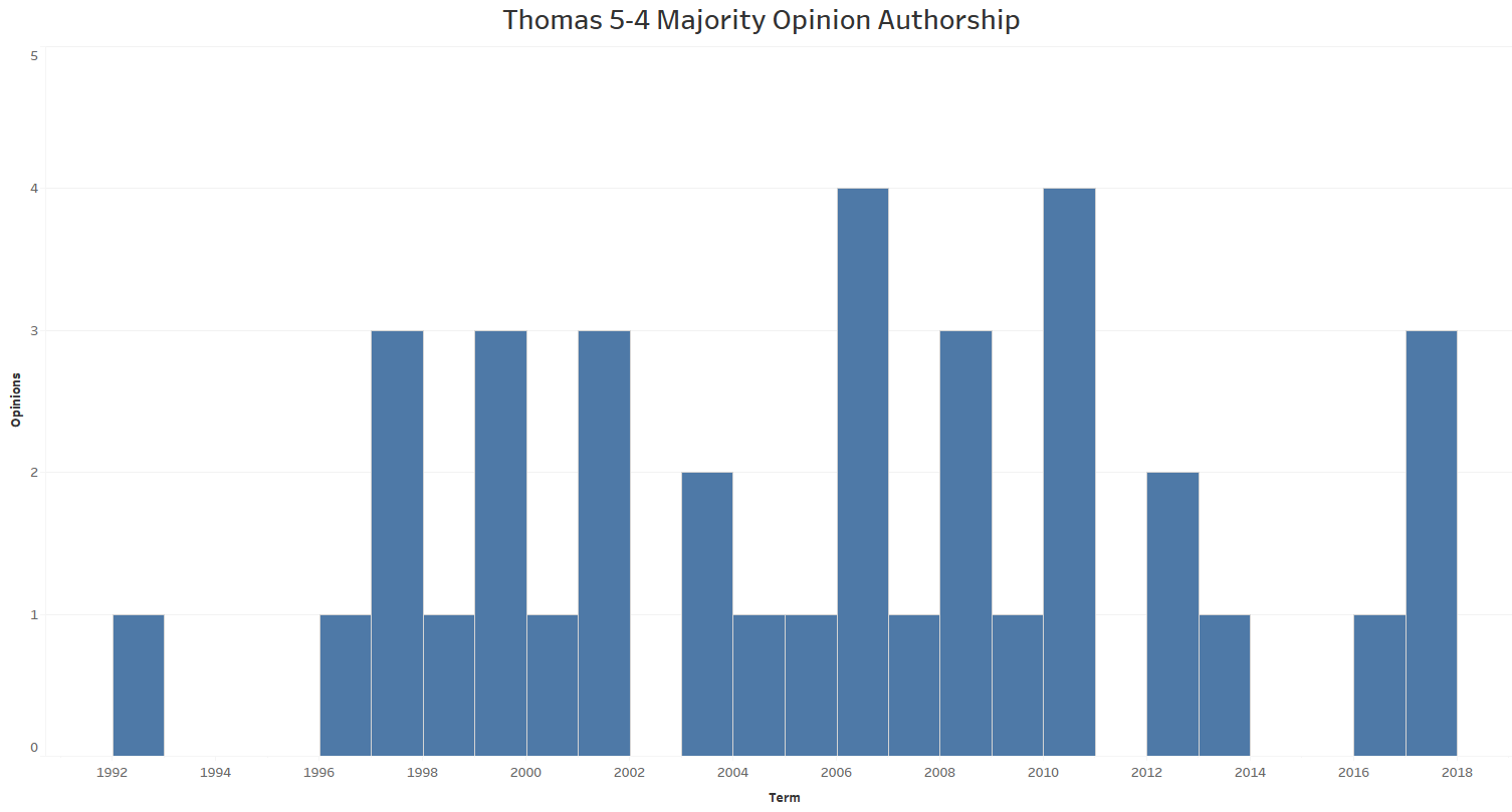Keeping the focus on Thomas for a minute, the greatest number of 5-4 decisions he wrote in a previous term was four in 2006 and in 2010. If he writes another 5-4 majority opinion out of the court’s remaining 20 decisions, he will have written five 5-4 majority opinions for the first time in his 28 terms on the court.