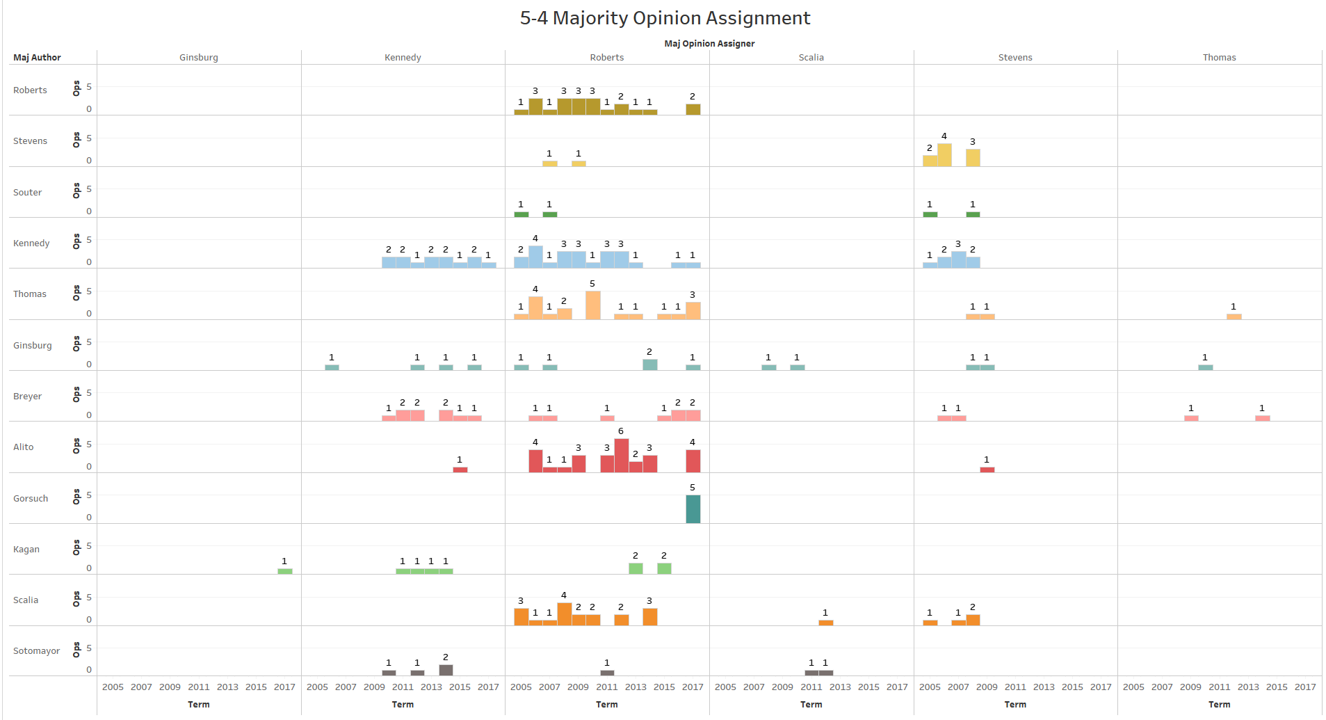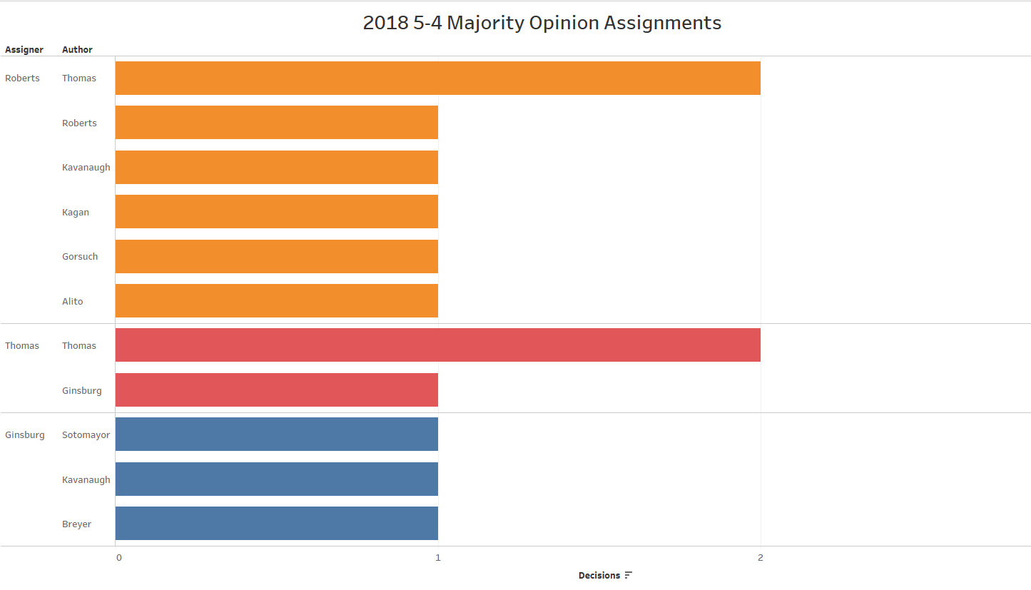 Looking at past opinion assignments during the Roberts Court years, we may note that Thomas had only assigned himself to write one 5-4 majority opinion prior to this term. This was in the 2012 decision Alleyne v. U.S. The horizontal axis below shows assigning justices (and terms on the bottom), while the vertical axis contains the authoring justices.