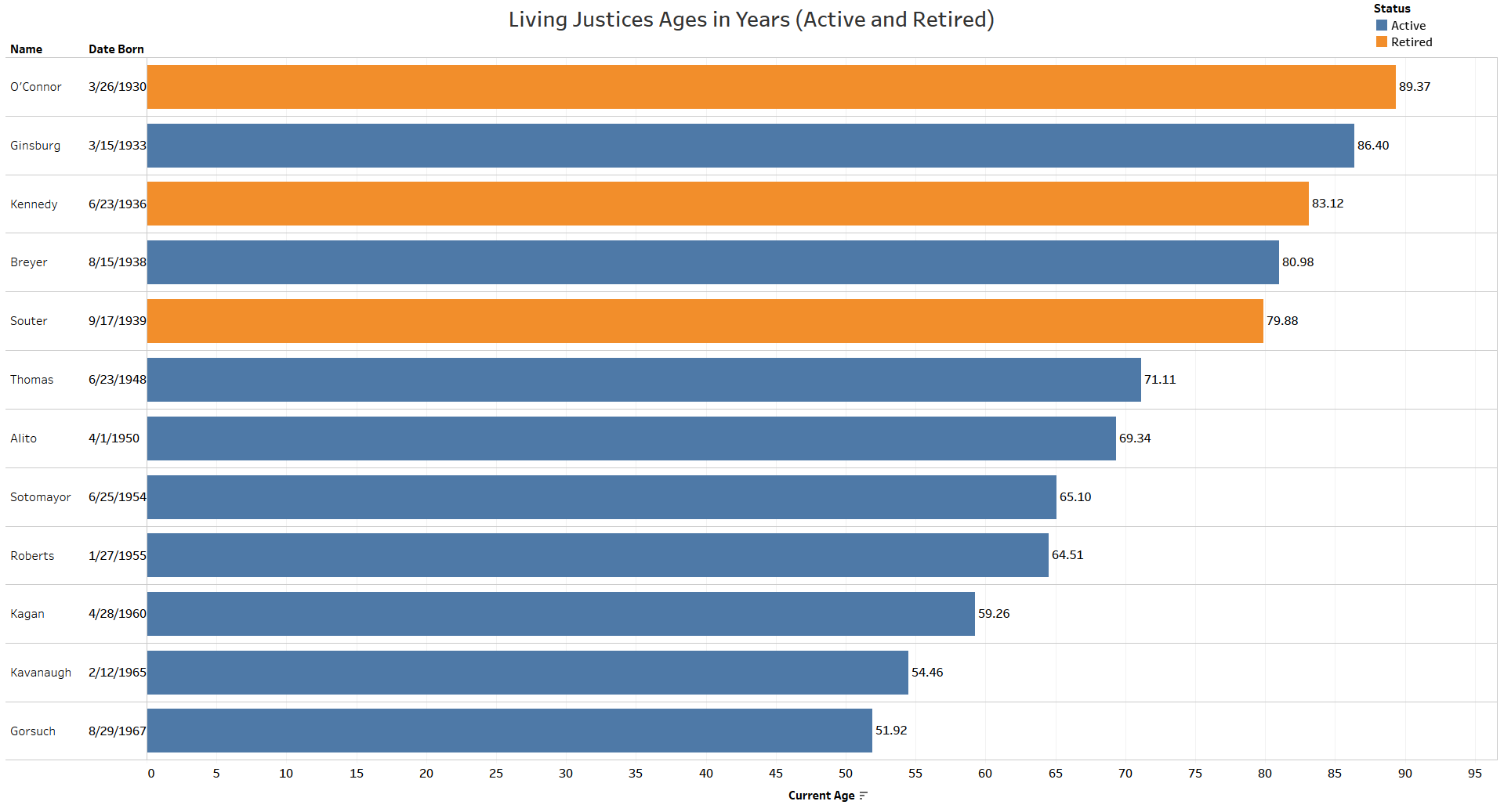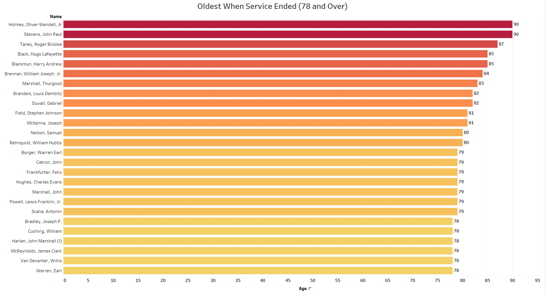 With Justice John Paul Stevens’ passing yesterday on July 16, 2019, went the oldest person ever to serve on the Supreme Court. At 99 years of age, Stevens was four years older than the previous justice to live longest, Stanley Reed, who was born in 1884, confirmed to the court in 1938 and died in 1980. Stevens was born in 1920 and confirmed to the court in 1975 (Data for justices’ ages was derived from the Supreme Court Justices Database.).