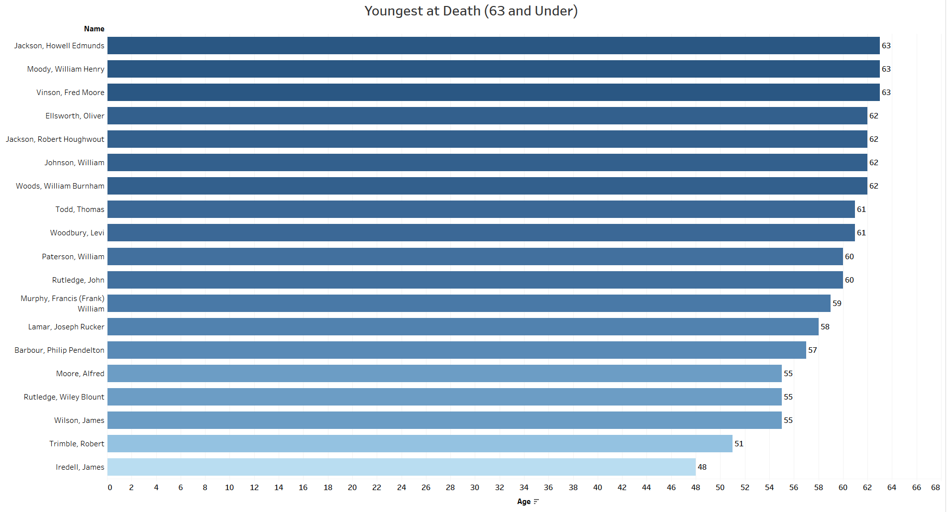 All the justices who passed away under the age of 64 were born prior to the turn of the 20th century. Chief Justice John Rutledge was born earliest of this group, in 1739.