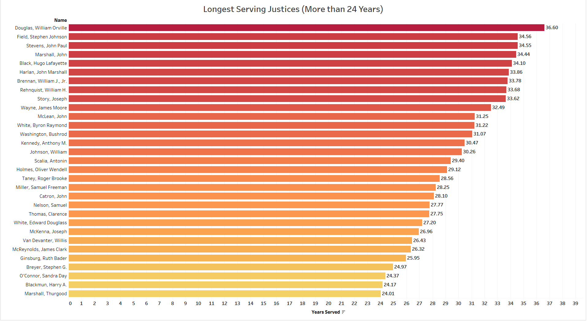Justice William Douglas served the longest of the justices at over 36 years, or just over two years longer than both Stevens and Field. Others to serve into their 34th year on the court include Justice Hugo Black and Chief Justice John Marshall.