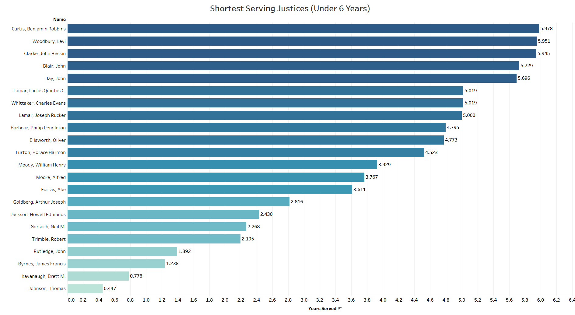 Kavanaugh has currently served the second shortest period of time on the court. Johnson and Kavanaugh are the only two justices to serve less than one full year (Kavanaugh will have served a year on the court on October 6, 2018.). Gorsuch currently has the sixth shortest tenure on the court at under 2.5 years. All other active justices have sat on the court for more than six years.