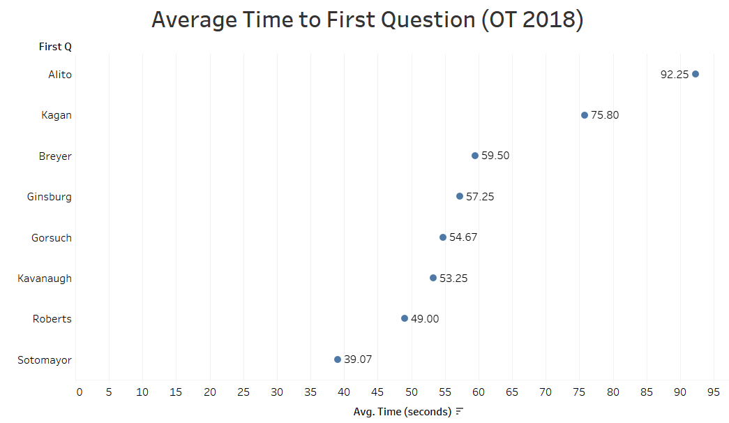 At 39 seconds, Sotomayor was almost 10 seconds quicker than Roberts, the second-fastest justice to the first question. On the other end of the spectrum, Justice Elena Kagan waited almost 76 seconds on average to ask her first question when she was the first questioner, and Justice Samuel Alito averaged over 92 seconds before he jumped in first.