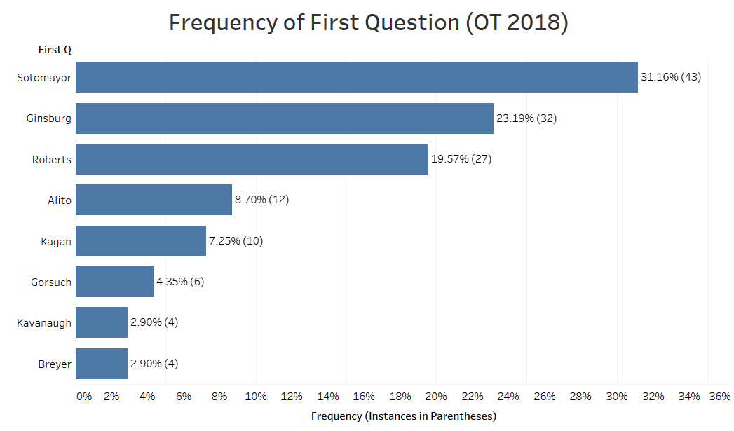 Sotomayor led the way, asking the first question over 31 percent of the time. She was followed by Justice Ruth Bader Ginsburg, who asked the first question over 23 percent of the time, and Chief Justice John Roberts, who asked the first question just over 19.5 percent of the time. The other justices had much lower frequencies of asking the first question.