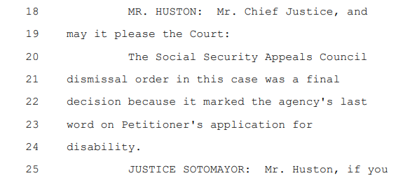 This has potential to be a drastic change from past practice. Last term, the attorney who had the shortest amount of time for opening remarks before a justice interjected was Michael Huston in Smith v. Berryhill. Huston spoke for 11 seconds before Justice Sonia Sotomayor jumped in with her first question. (Timing was measured from oral-argument recordings on Oyez.org.) This point in the transcript is shown below.