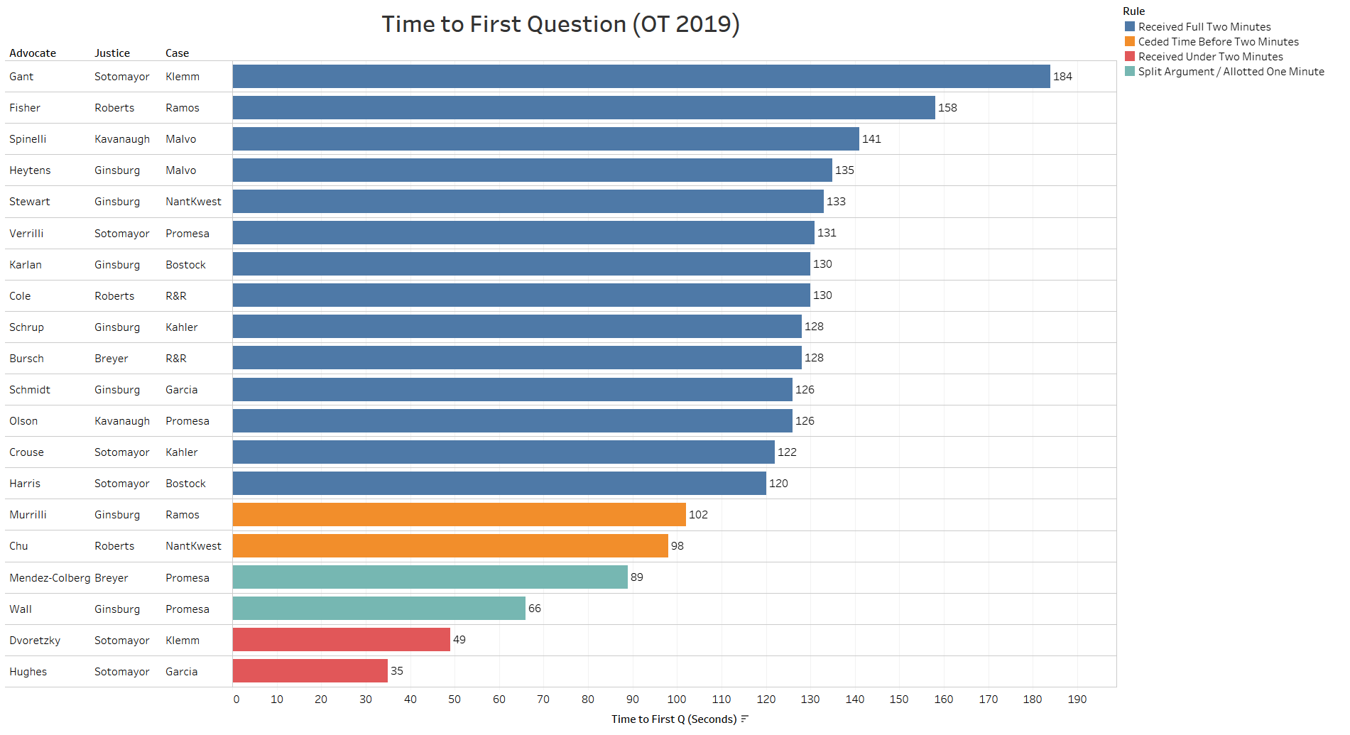 Sotomayor stymied advocates from reaching the two-minute marker in their opening remarks twice so far this term. Twice advocates did not make it to the two-minute marker on their own accords. Although the justices may seek to offer advocates more time to give uninterrupted remarks at the beginning of each argument, more work will need to be done before this intention becomes a consistent reality.