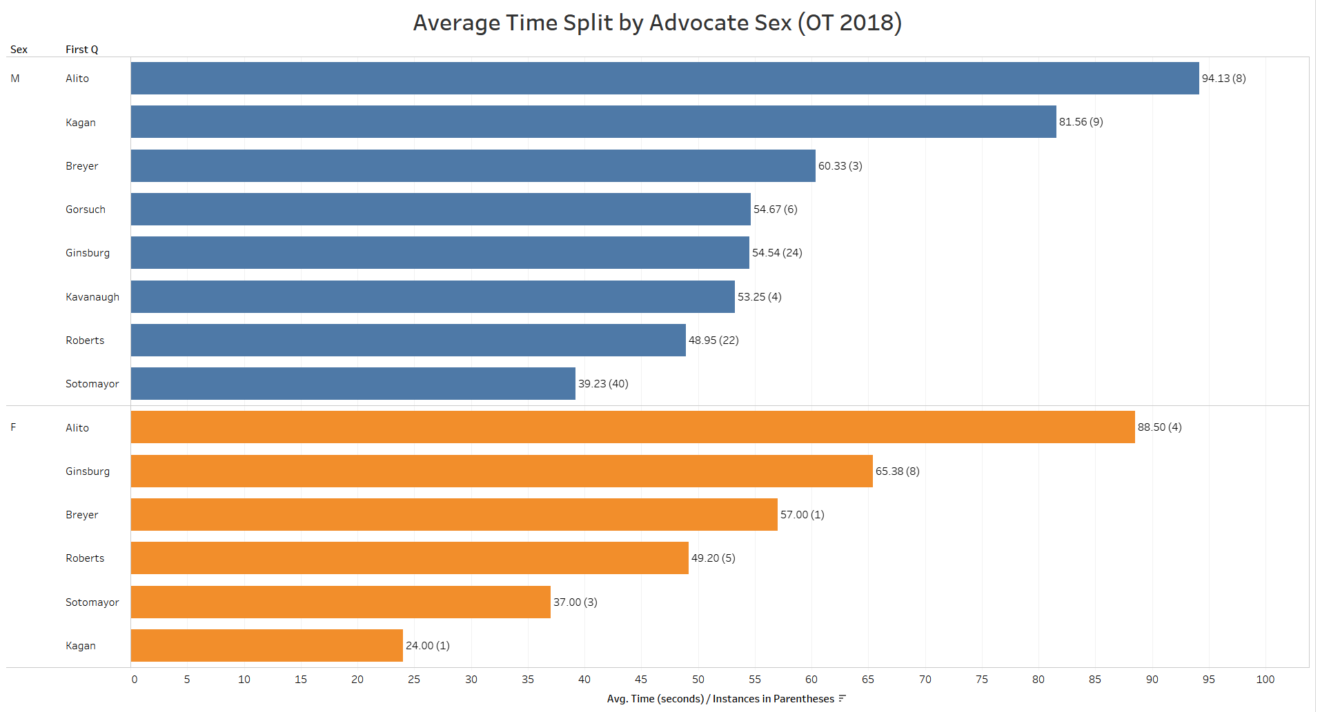 Justices Neil Gorsuch and Brett Kavanaugh were never the first justices to ask questions to a female advocate. Based on the proportion of female to male advocates, Alito asked a high rate of first questions to females, although his time to the first question was at the high end for both male and female advocates. Like Alito’s, most of the justices’ averages times were appreciably similar for male and female advocates. Because Kagan only asked a first question to a female advocate once, her 24-second average is not particularly meaningful. Sotomayor appeared less apt to ask first questions to female advocates as well, with 40 first questions to male advocates compared to only three to female advocates.