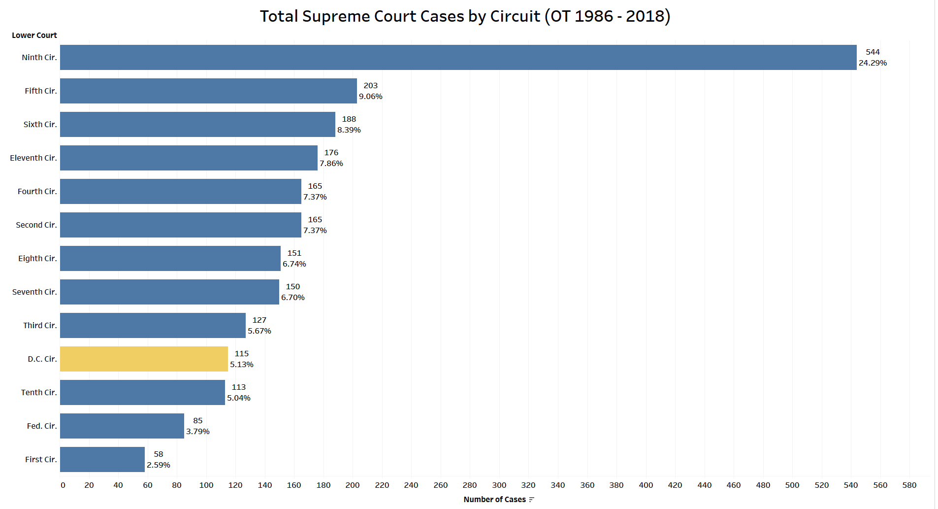 The Supreme Court heard nearly twice as many cases from the D.C. Circuit than from the U.S. Court of Appeals for the 1st Circuit during this period, but only about a fifth as many cases as it heard from the U.S. Court of Appeals for the 9th Circuit (As a point of reference, the 9th Circuit decided nearly 10 times as many cases as the D.C. Circuit this past year.).