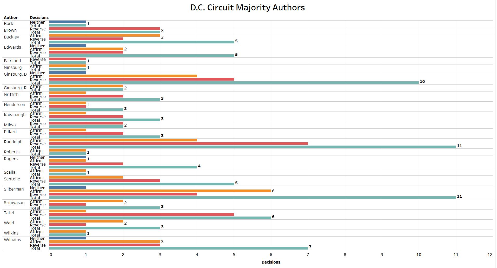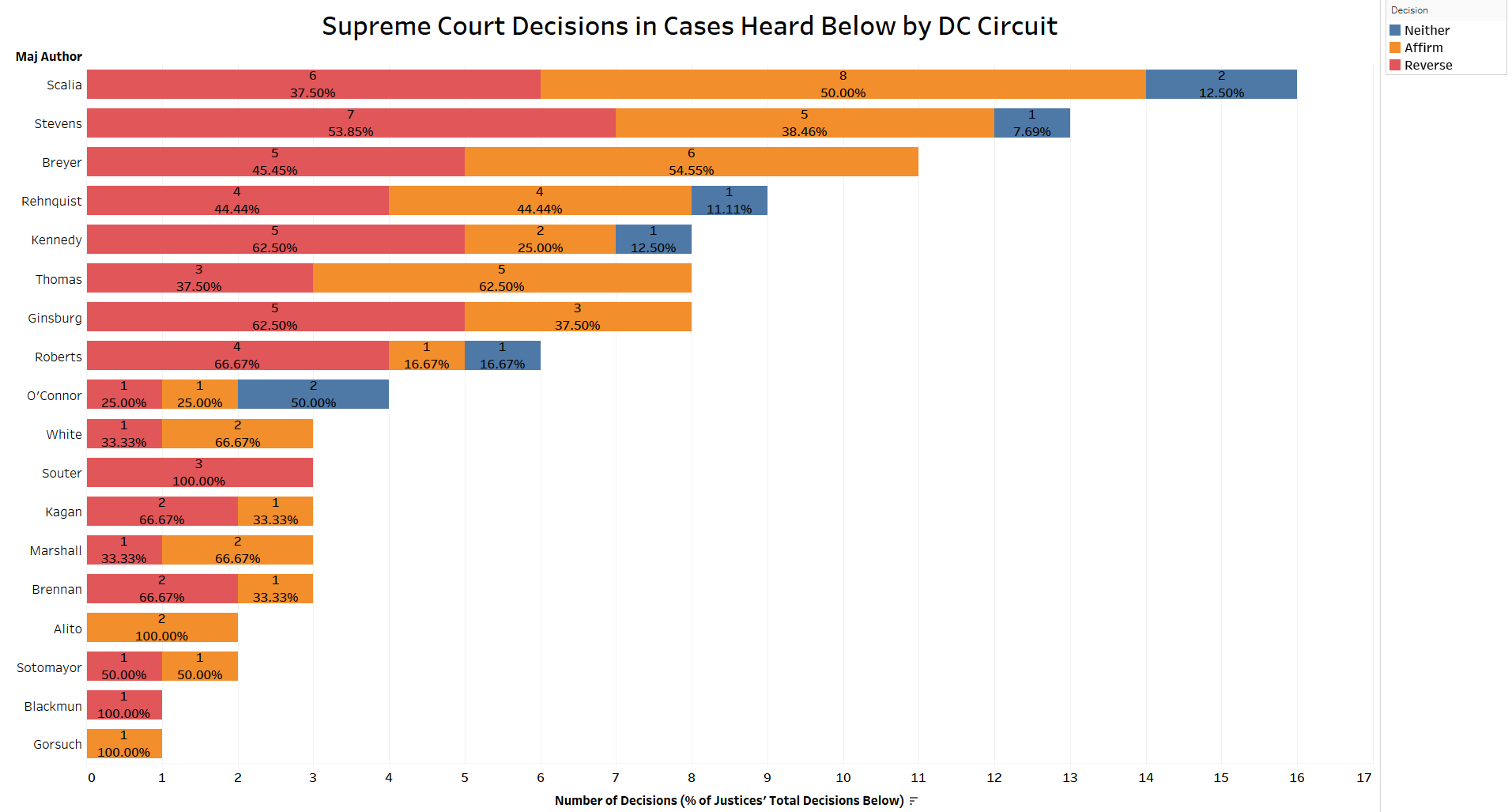 Justice Antonin Scalia wrote majority decisions in more of these cases than any other Supreme Court justice, with 16. He affirmed 50 percent of them and only reversed 37.5 percent. Of the justices who wrote majority opinions in at least eight cases coming from the D.C. Circuit, only Stephen Breyer and Clarence Thomas had higher affirmance rates than Scalia. Judges with high reversal rates of D.C. Circuit decisions and more than three total decisions in this set include Ginsburg at 62.5 percent and Roberts at 66.67 percent.