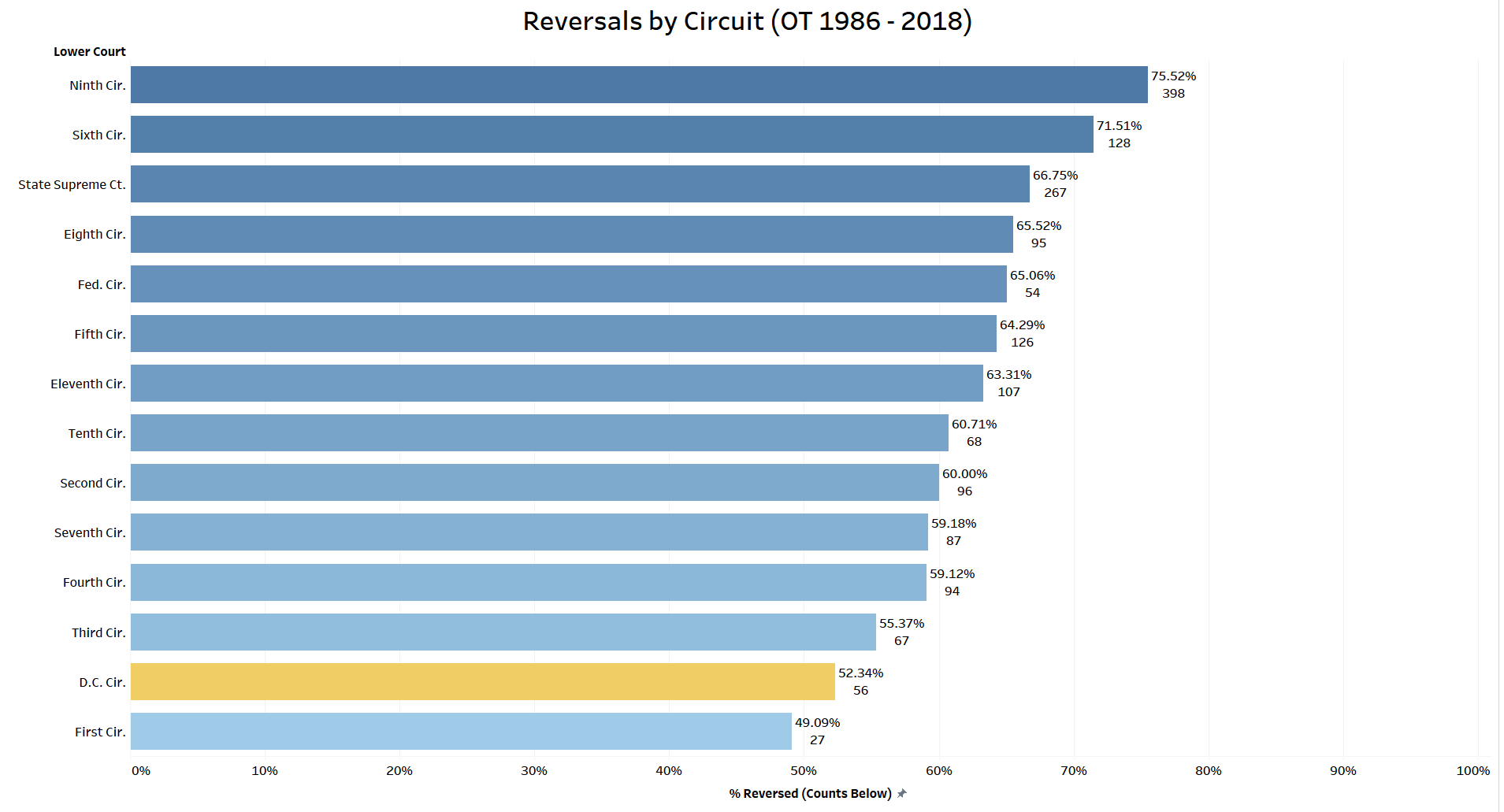 One unique area for the D.C. Circuit is Supreme Court reversals. D.C. Circuit decisions have been reversed the second-least frequently of decisions from any circuit over this period.