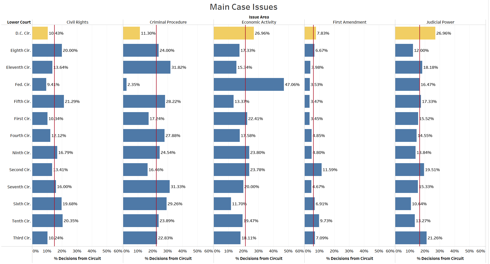The D.C. Circuit hears a unique set of cases that make their way to the Supreme Court. According to the Supreme Court Database’s coding for issue area, cases from the D.C. Circuit that eventually make their way to the Supreme Court are much more frequent in certain common areas.