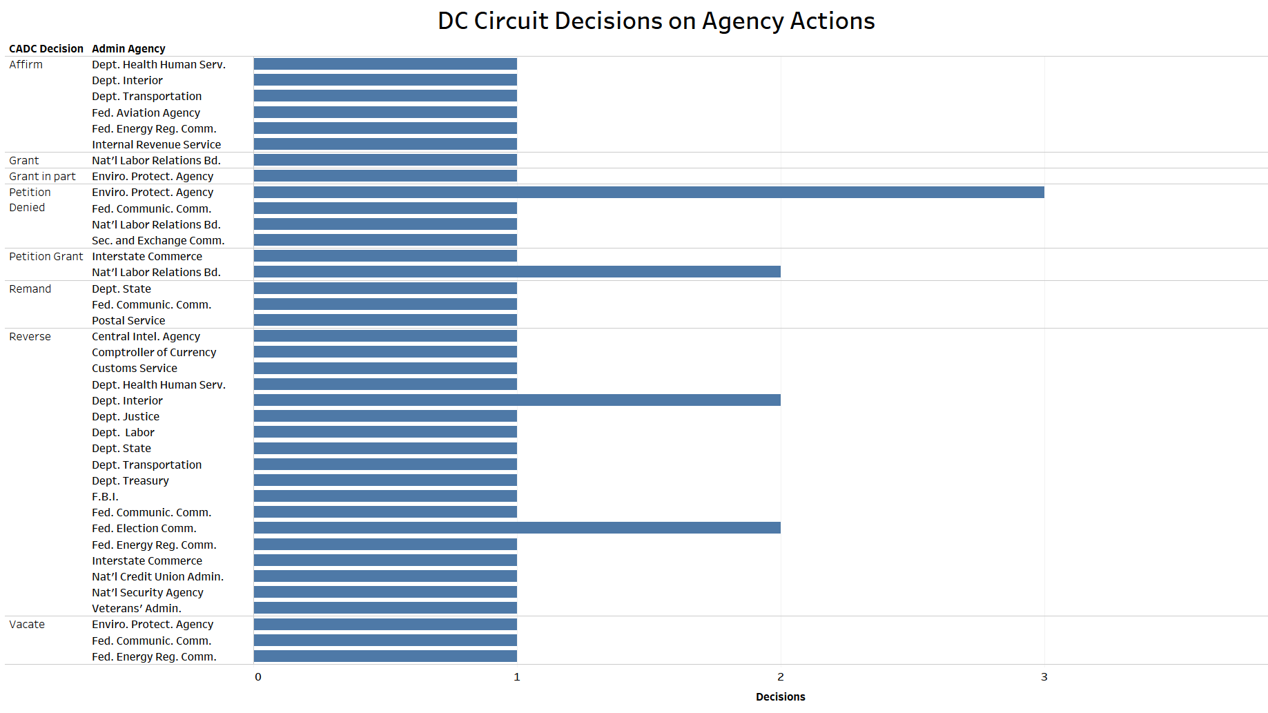 In contrast to the Supreme Court’s relatively low reversal rate of decisions from the D.C. Circuit, the D.C. Circuit reverses a relatively high number of agency decisions. The D.C. Circuit’s decisions from agency actions that later led to Supreme Court cases are displayed below.