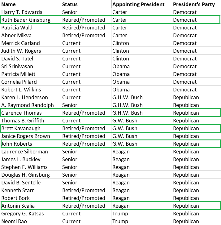 More current and recent Supreme Court justices previously served on the D.C. Circuit than on any other court. Four of the nine current justices on the Supreme Court were previously D.C. Circuit judges. The following table shows the judges who sat on the D.C. Circuit during any year from 1986 until today whose decisions led to Supreme Court cases,who currently sit on the D.C. Circuit, or who currently sit on the Supreme Court and were elevated from the D.C. Circuit, along with their current status and their appointing president. Current and past Supreme Court justices are enclosed in green.