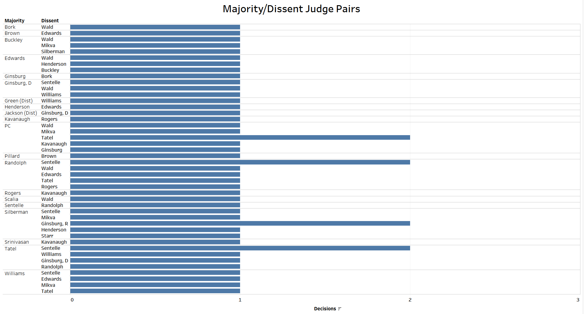 Another way to break down these relationships is by majority/dissent judge-pairs in cases the Supreme Court later heard. Of the judge-pairs, only three had more than one case that the Supreme Court later decided. “PC” cases are per curiam decisions in which no D.C. Circuit judge was listed as a majority author.