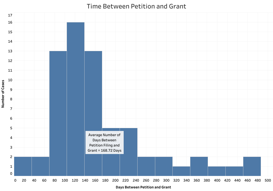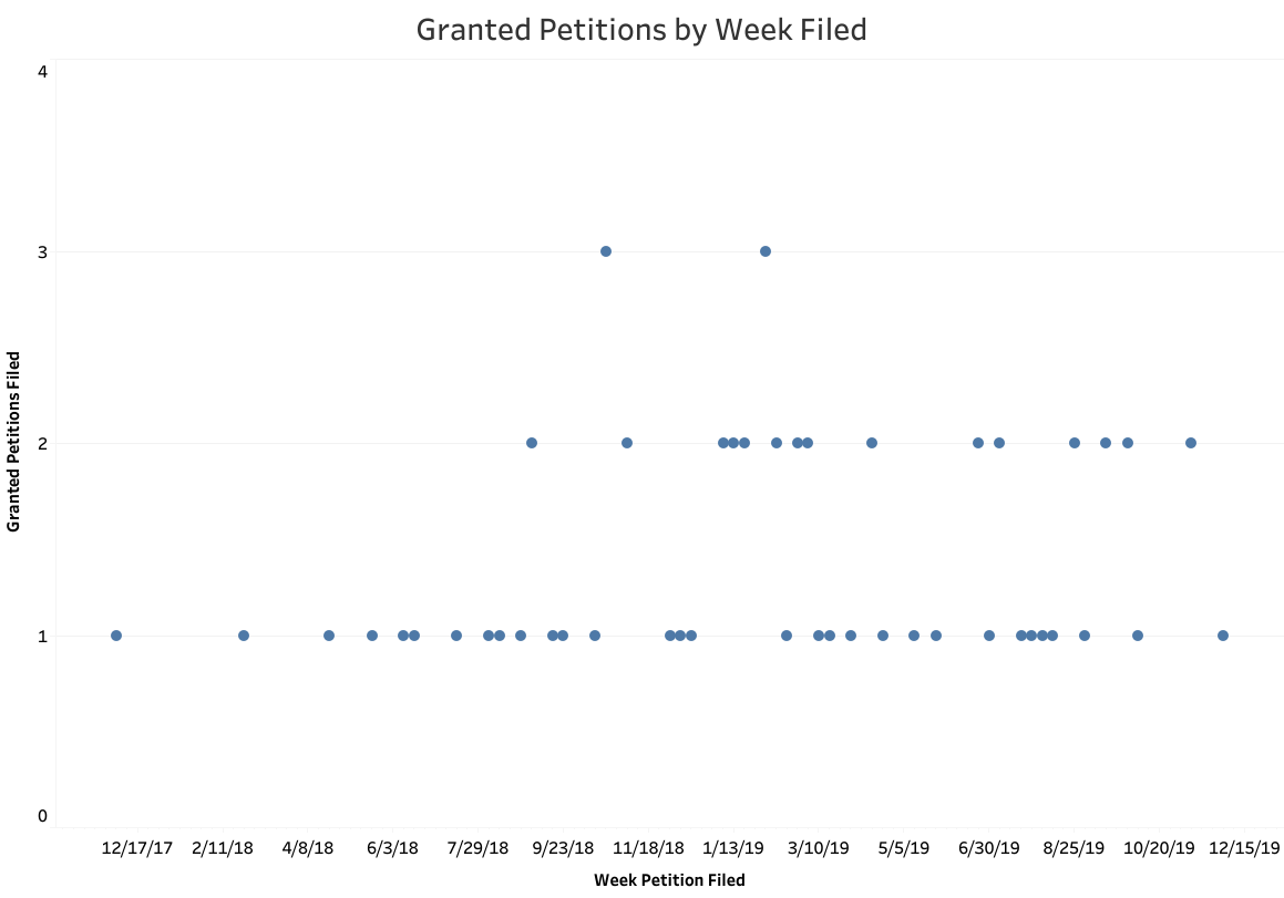 The most granted petitions filed within the same week, three, were filed during the weeks of October 21, 2018, and February 3, 2019. The court also granted two petitions filed during the same week for several weeks between October 21, 2018, and February 3, 2019, highlighting the importance of strategically timed petition filing.