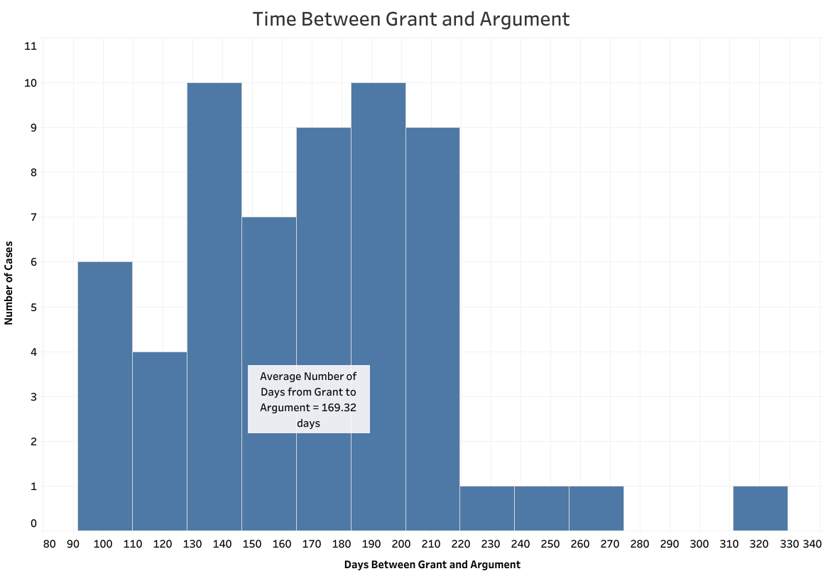 The justices took an average of 168.72 days from the filing date to grant petitions for argument this term. (It’s worth noting that this time period can be drawn out if the respondent requests an extension to file their brief or the solicitor general is invited to share the views of the federal government).
