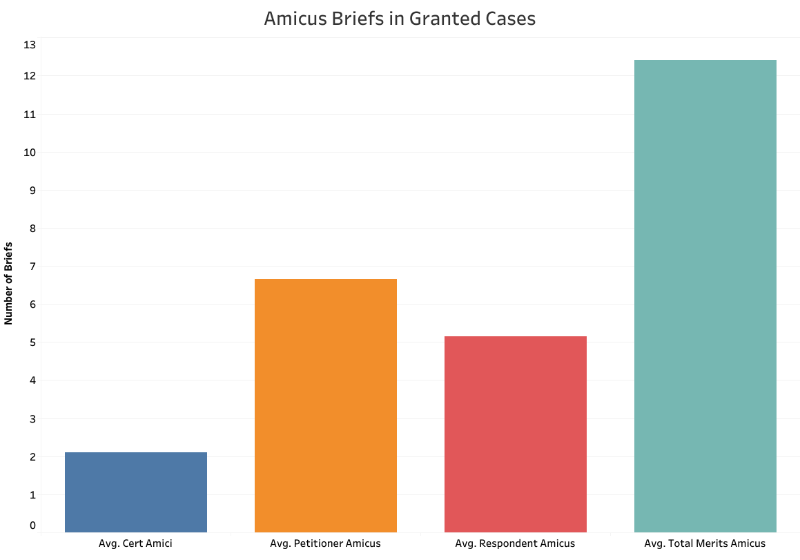 Merits cases have averaged just over 12 amicus briefs so far this term, with petitioners averaging 6.66 briefs and respondents averaging 5.15 briefs. R.G. & G.R. Harris Funeral Homes Inc. v. Equal Employment Opportunity Commission has the most merits amicus filings with 86, followed by June Medical Services LLC v. Gee with 70 and Bostock v. Clayton County, Georgia with 68 (for a deep dive into cases with a large number of amicus briefs in previous terms, see this paper). Because we don’t have all the amicus filings in all cases for this term, the averages in the chart above as well as this ranking of cases with the most amicus filings may shift before the term is complete.