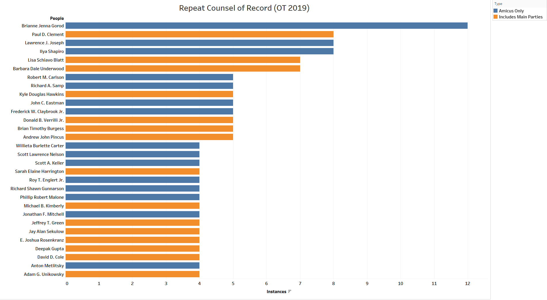 The amicus filings so far this term include many filed by repeat players who have been active in Supreme Court litigation for years. A look at counsel of record for all merits-stage briefs, both for amici and for parties to the dispute, filed in cases this term bears this out.