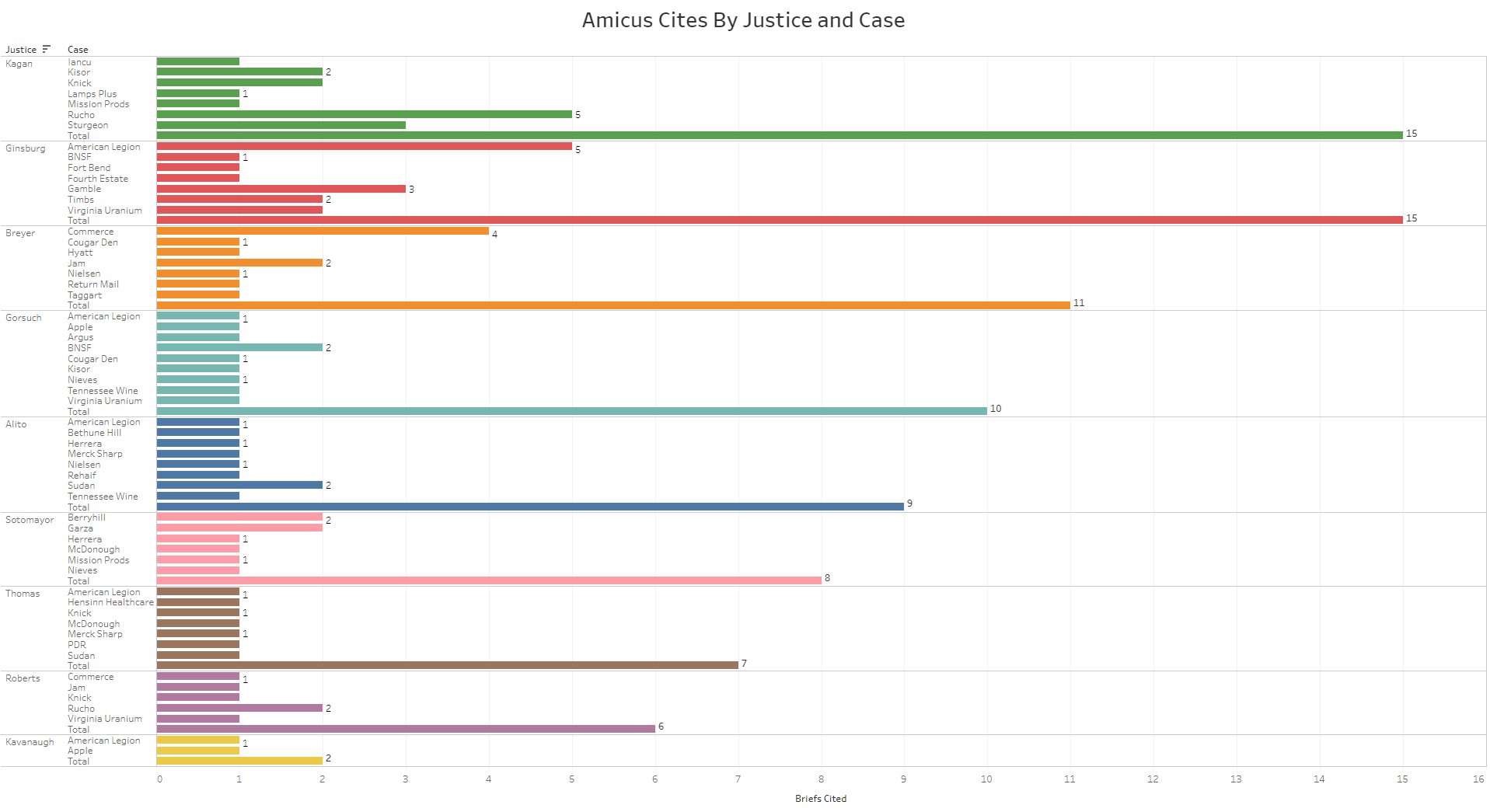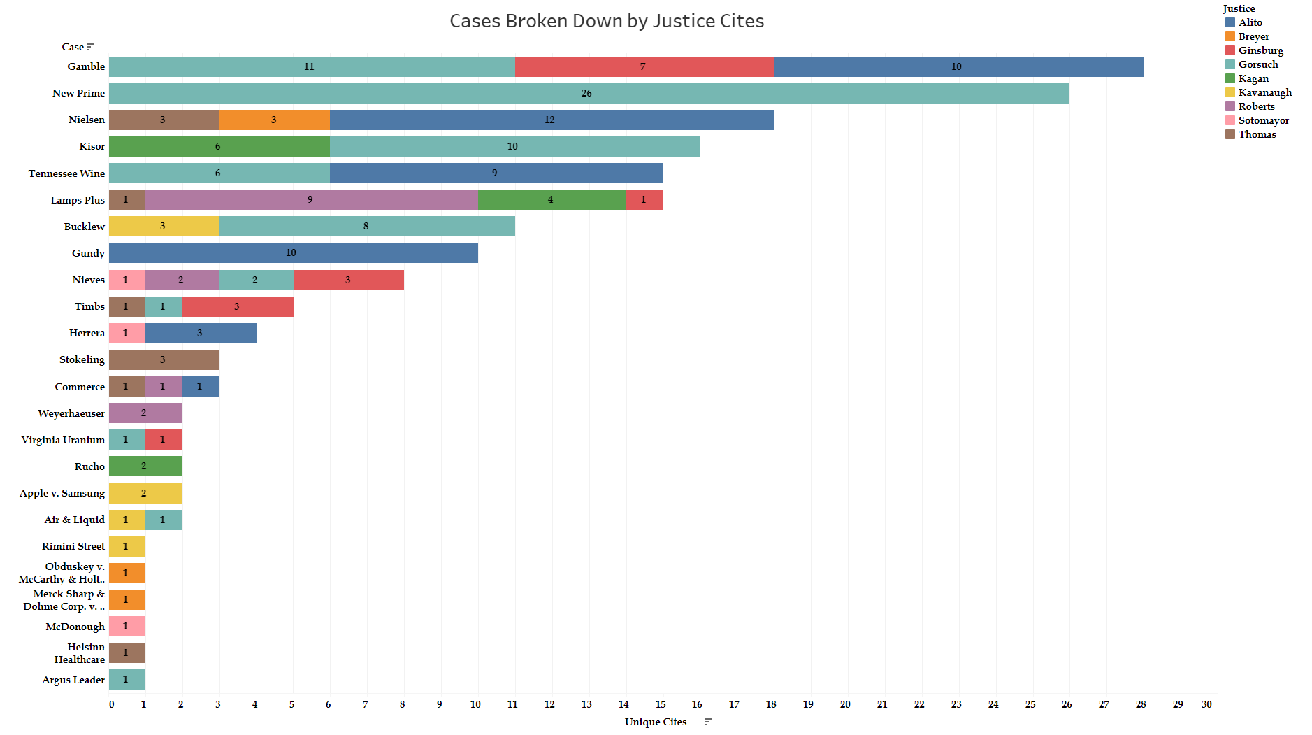 The next figure looks at this data by case and justice. The legend on the right conveys the bar color for each individual justice. The number within each bar is the number of unique cites by that justice in their opinion for that case.