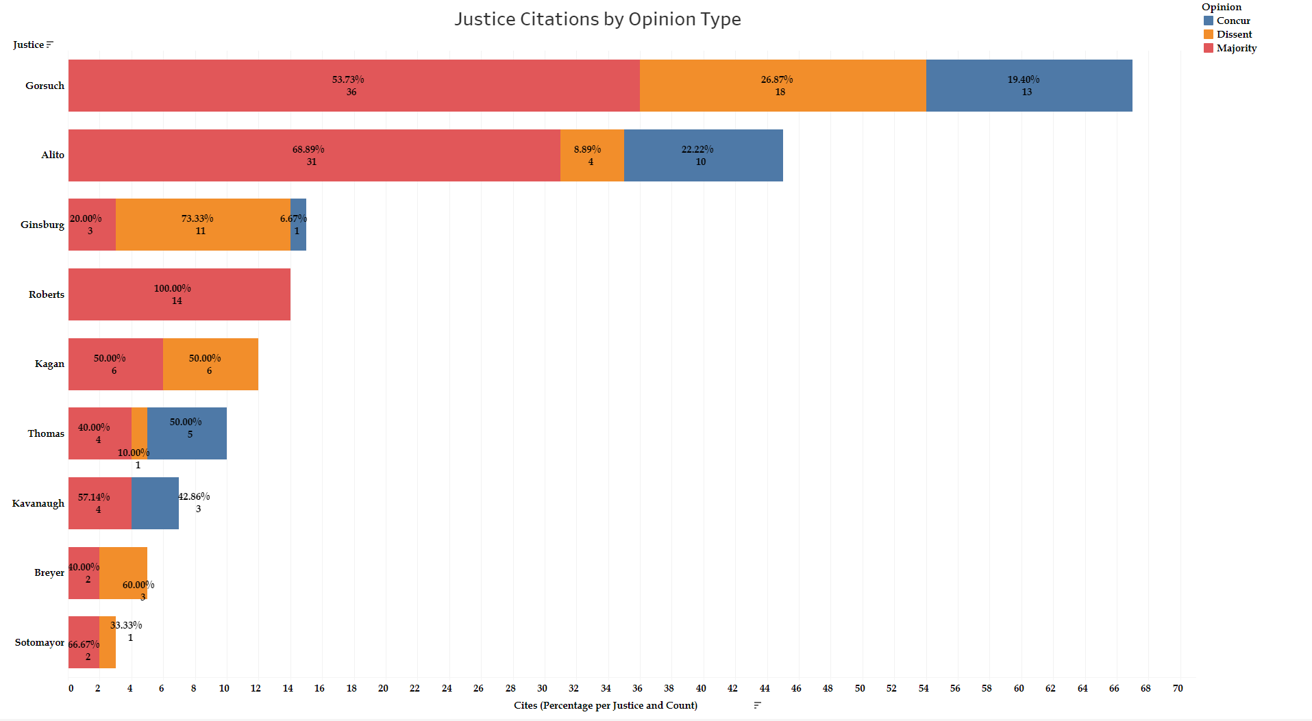 First, breaking this down by justice and opinion type, we see significant variation in the number of these unique cites by justice. Within each colored bar, the top number is the percentage of the cites by opinion type for each justice, and the bottom number is the corresponding count.